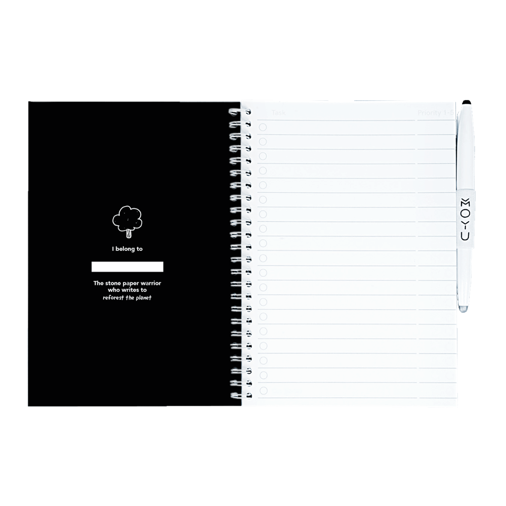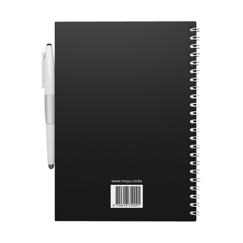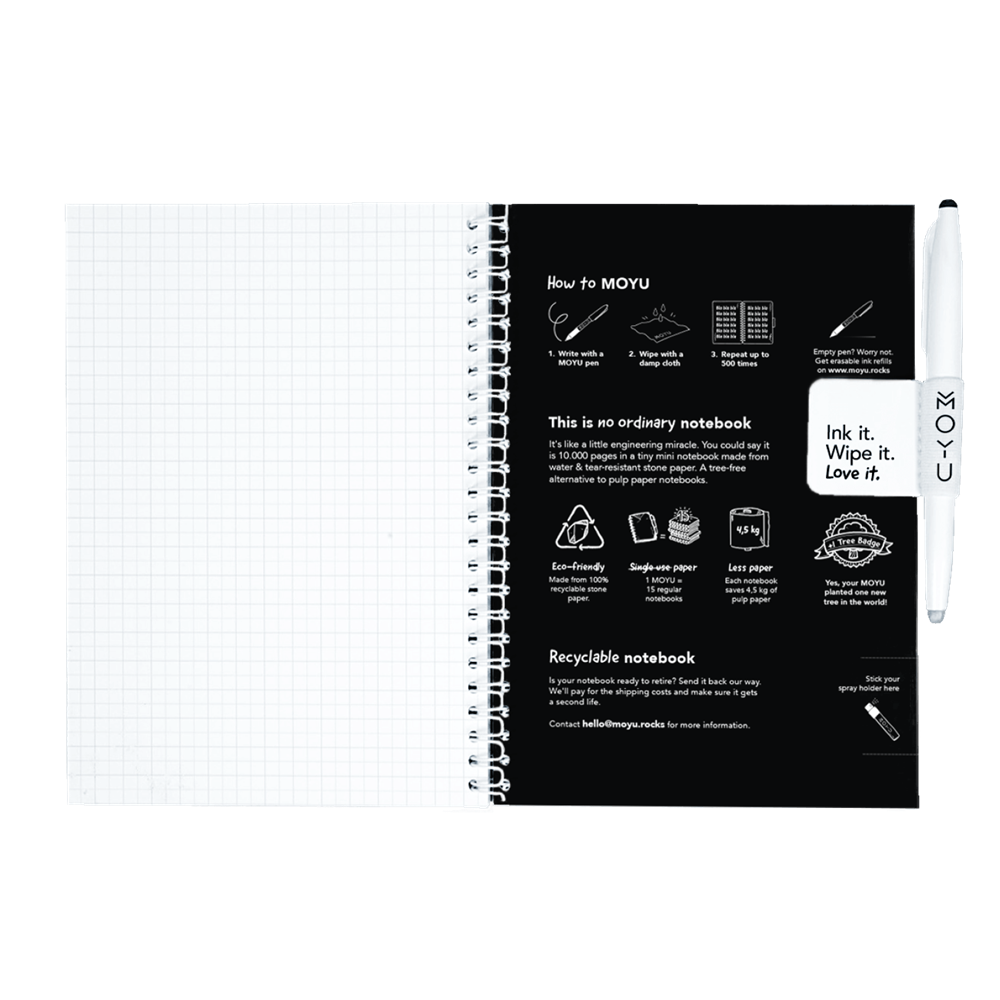 A MOYU notebook is made of stone paper. But this stone paper is even more special than you might have seen or tried before. This is because this stone paper is very sturdy. The notebook comes with a Pilot Frixon pen and a cloth. You write in the notebook with this pen. And with a damp cloth you wipe away the text you have written in 1x. Wiping it off is not easy when you go over it with your hand, so the text stays put. But as soon as you go over it with a wet cloth, your page is completely empty again. And hence the sturdy paper. This allows you to use and clean a page up to 500 times!