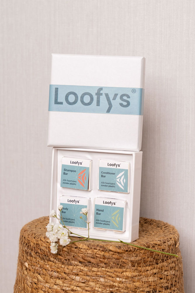 Set of mini soaps A fun wellness gift set of soaps from Loofy's to try out! The set includes a Mini shampoo bar, Mini body bar, Mini conditioner bar and Mini hand bar wrapped in pergamine paper.