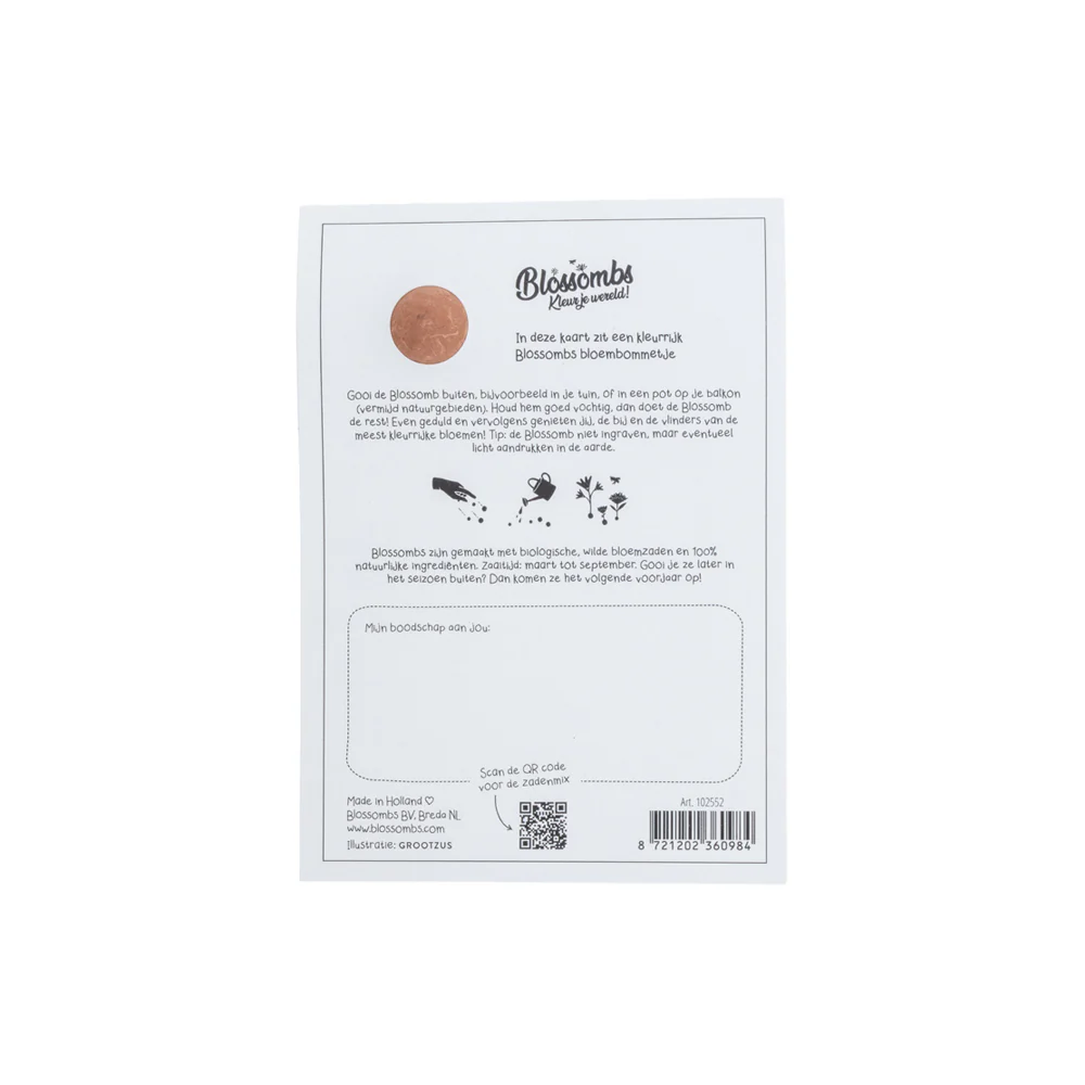 Throw the Blossomb outside, for example in your garden, on a vacant lot, in a bare verge or in a pot on your balcony (avoid natural areas). In spring, wildflowers will grow from it that you, the bee and the butterflies will enjoy.
