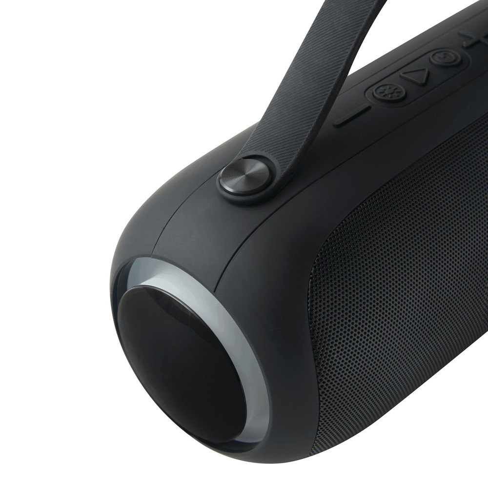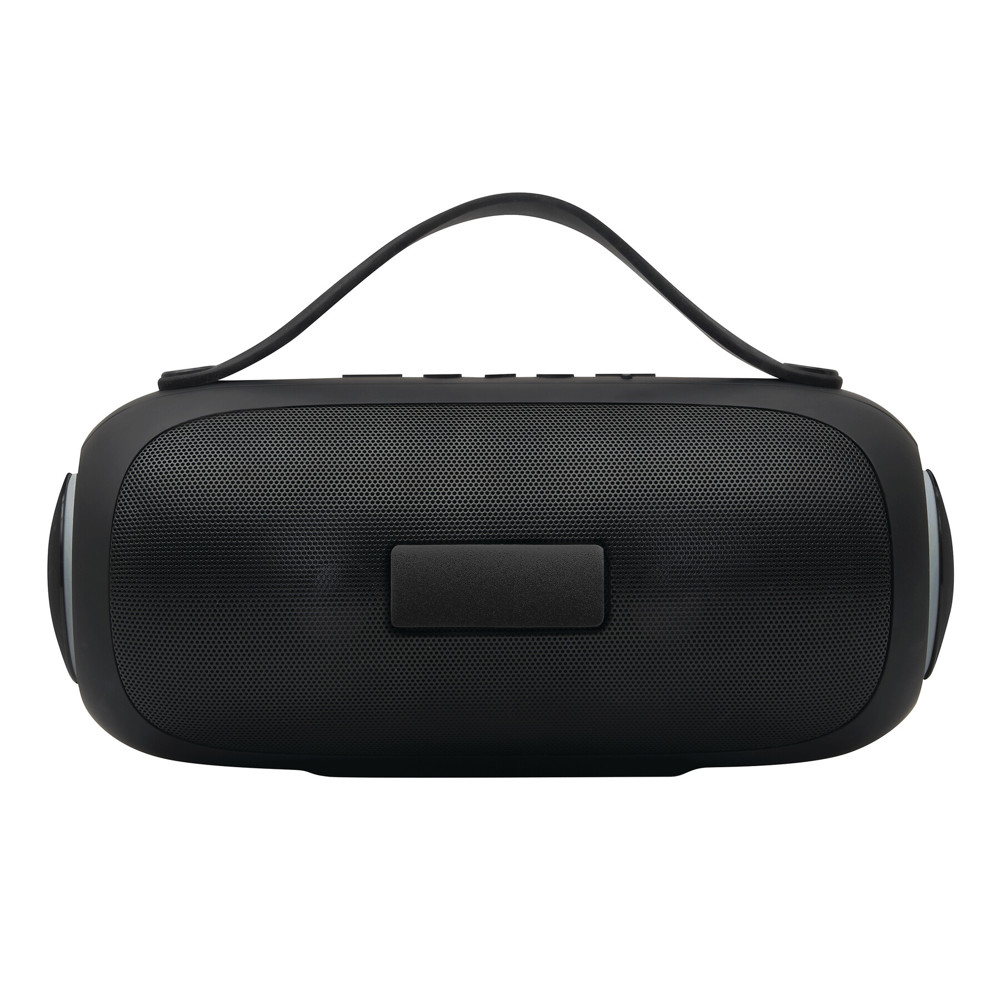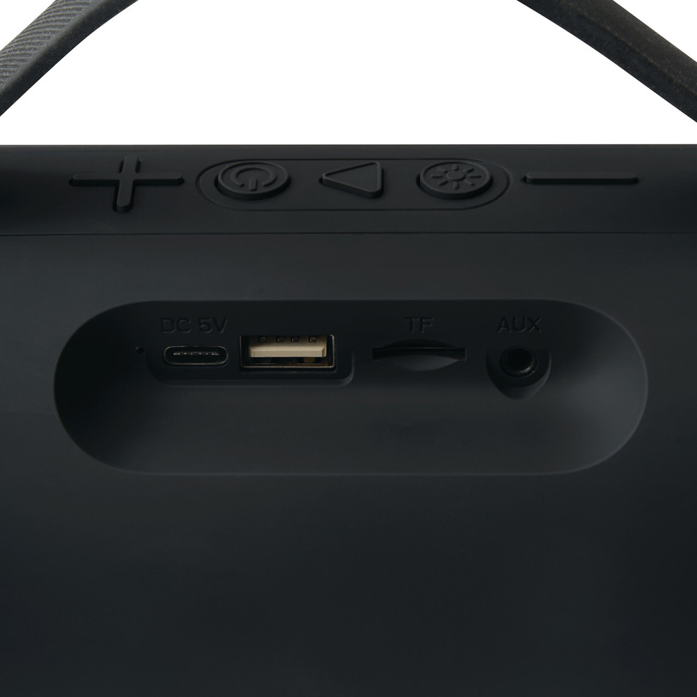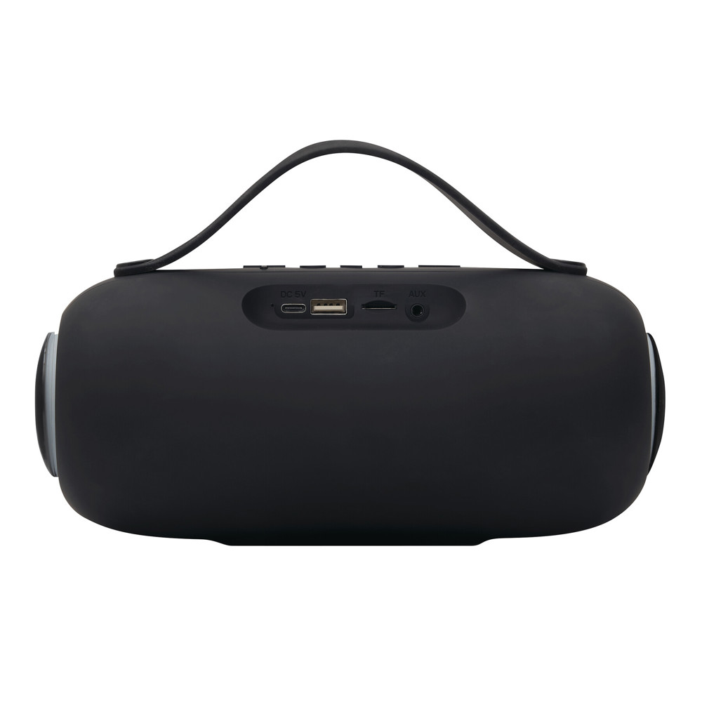 Wireless speaker GIGA BOOM: colour-changing LED light on the sides, music output 2 x 5 watt, can be paired with smartphones, compatible with Bluetooth®, max. range approx. 10 m, can be connected to external devices via AUX-IN connector, MP3 playback via microSD card slot and USB connection, hands-free function, powerful rechargeable battery, capacity 1.800 mAh, incl. USB charging cable (length approx. 50 cm, USB Type-C), incl. engraving plate with chrome underlayer for engraving, black silicone handle, 2 non-slip feet, in a box