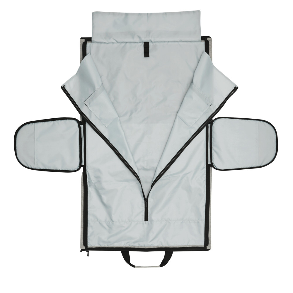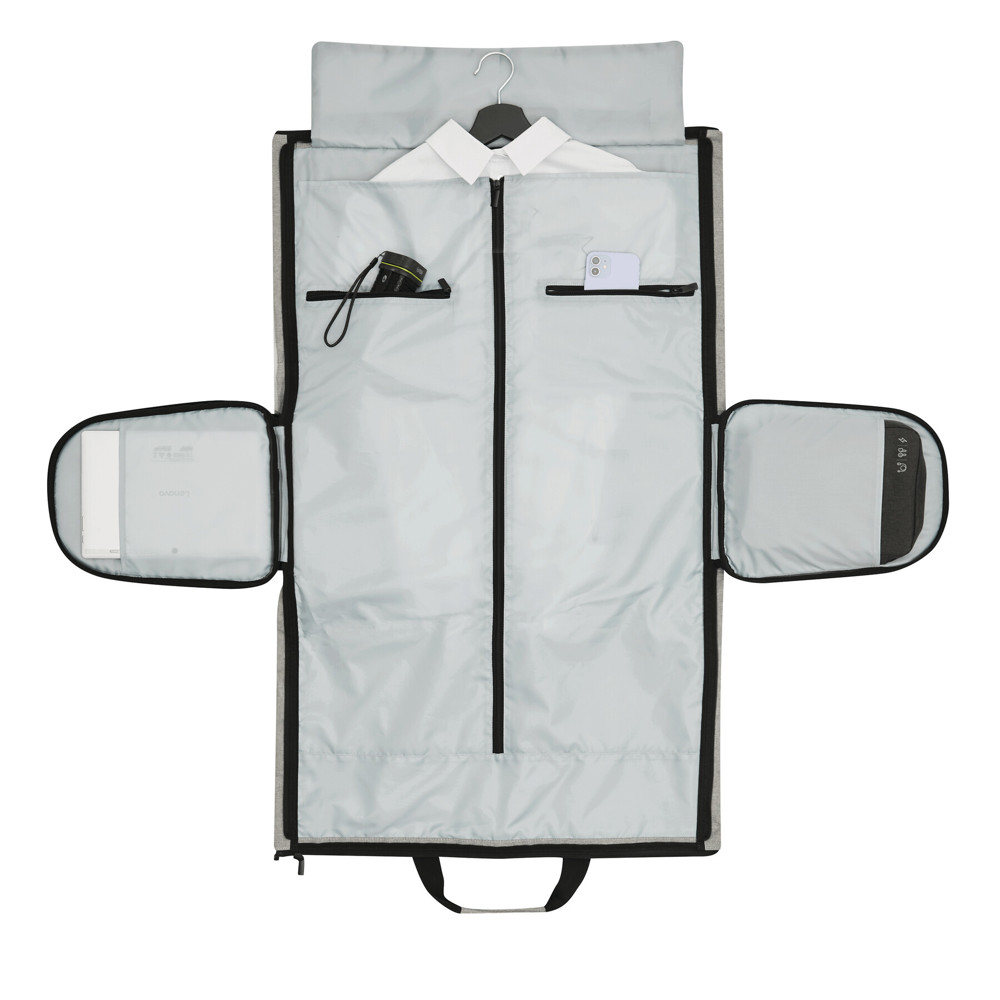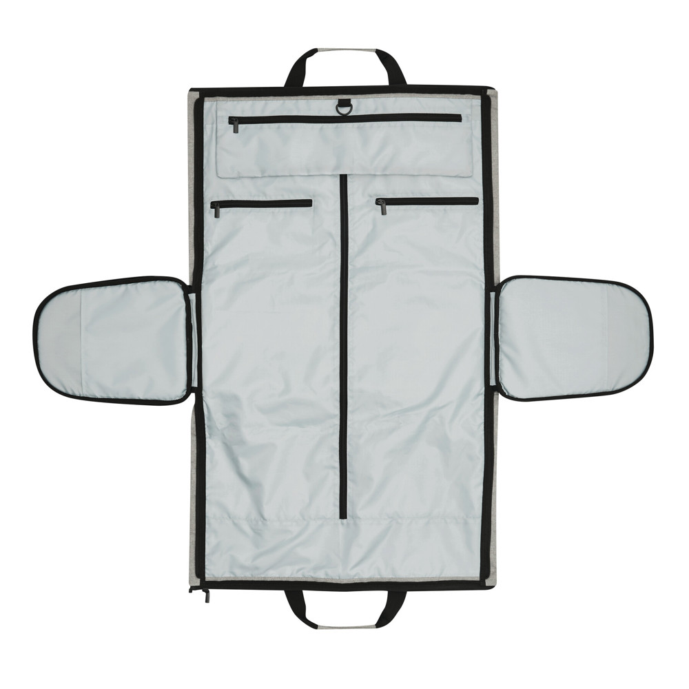 Travel bag MILANO with integrated garment bag: 1 main compartment with zip, 1 side pocket with zip, 2 reinforced carrying handles, adjustable and removable strap with shoulder pad, trolley sleeve on the back, 4 zips on the sides to open the bag completely, 1 metal ring to hang the garment bag, inside 1 main compartment with zip and 3 webbing loops to attach hangers, 2 side slip-in pockets, 2 small compartments with zip and 1 large compartment with zip