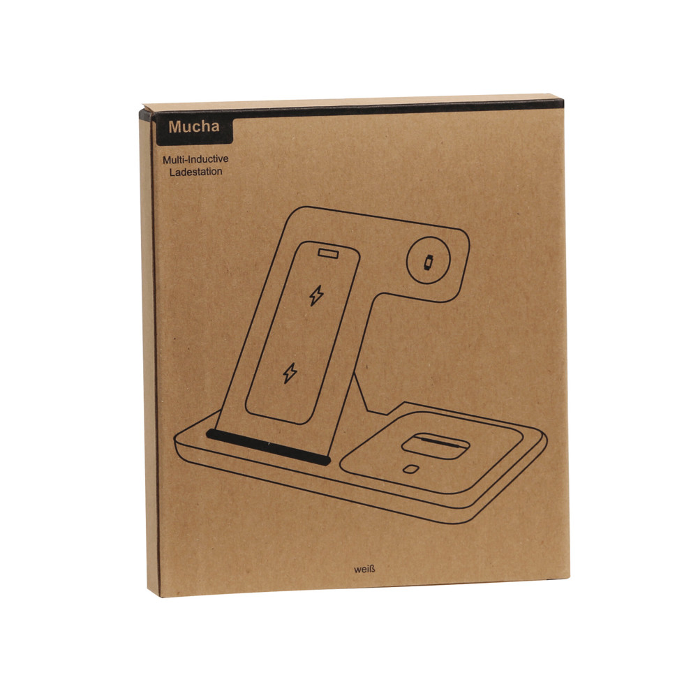 Multi inductive charging station MUCHA: foldable, wireless charging of up to 3 devices simultaneously (smartphne (horizontally or vertically), wireless in-ear headphones, Apple iWatch®) by placing them on the respective contact surface (device must be equipped for inductive charging), USB cable with USB Type-C plug (length approx. 80 cm), input power: 9V/2A, 12V/1,67A, output power: 5 W, 7,5 W, 10 W, 15 W, 2,5 W (for iWatch® and earphones), indicator light glows blue during the charging process, green when charging is complete, and flashes blue when foreign objects are detected, on/off switch for light, 4 anti-slip feet on the bottom, in box