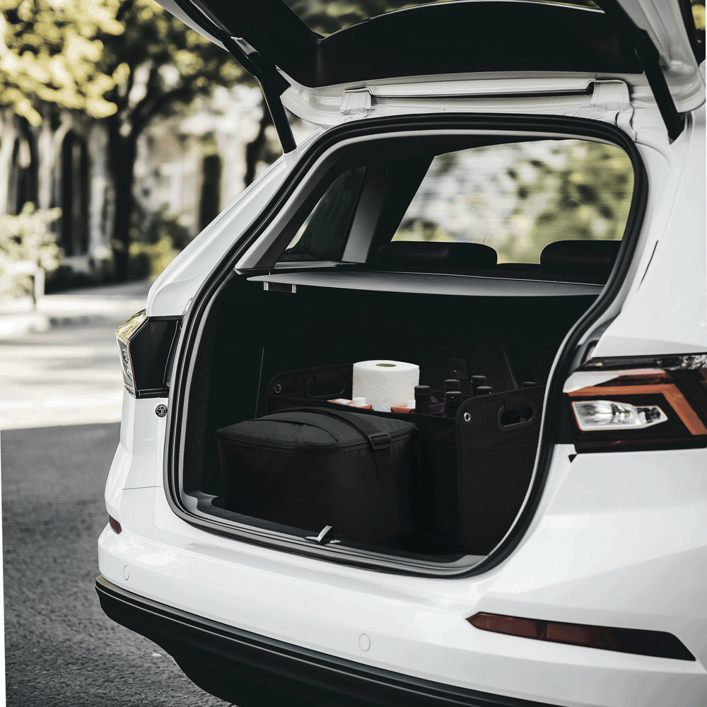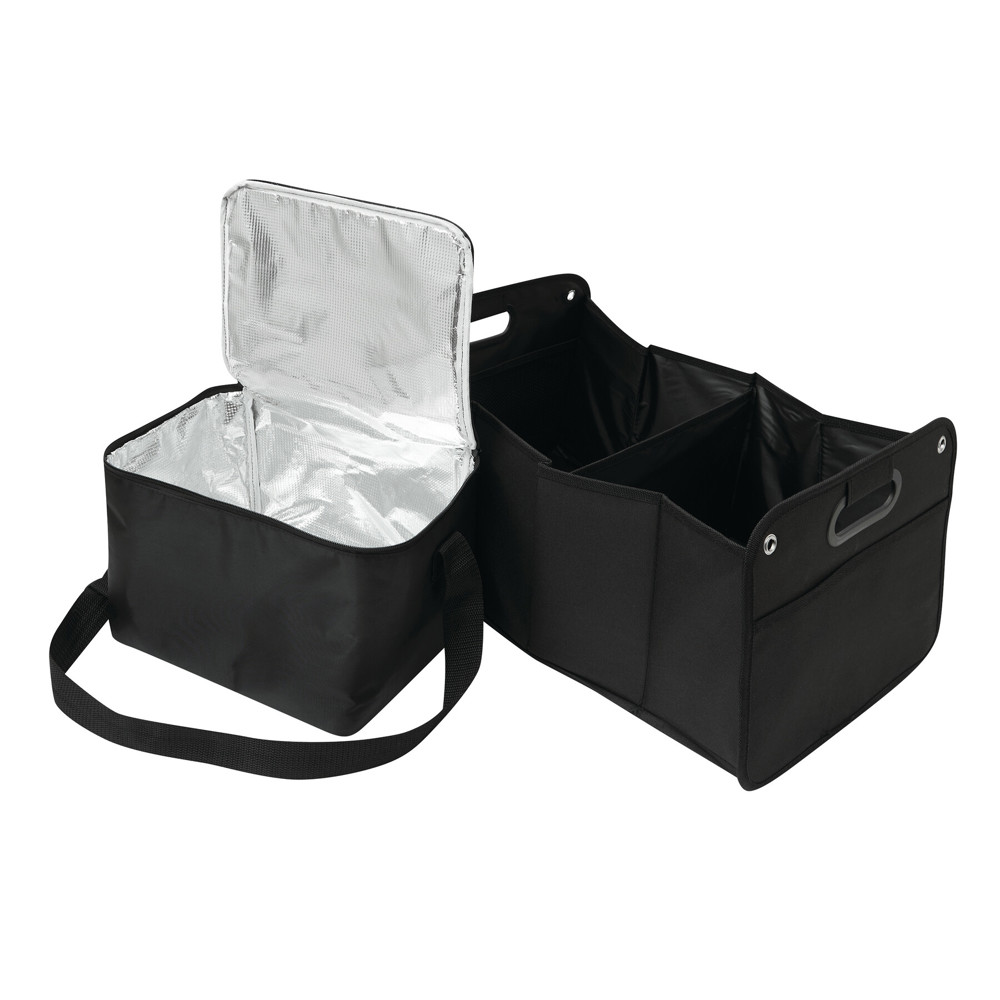 Luggage compartment bag set ISO-GADGET: 1.) removable cooler bag with an adjustable shoulder strap and slip-in pocket on the zipped lid, 2.) large foldable bag with 2 compartments and floor mats for a lot of storage space as well as 1 mesh pocket, 2 integrated carrying handles, with Velcro on the bottom for best hold in luggage compartment and 4 metal eyelets for anchoring – can be folded and secured with elastic belt to save space when not in use – both bags can be used separately, the cooler bag fits perfectly into either compartment of the main bag
