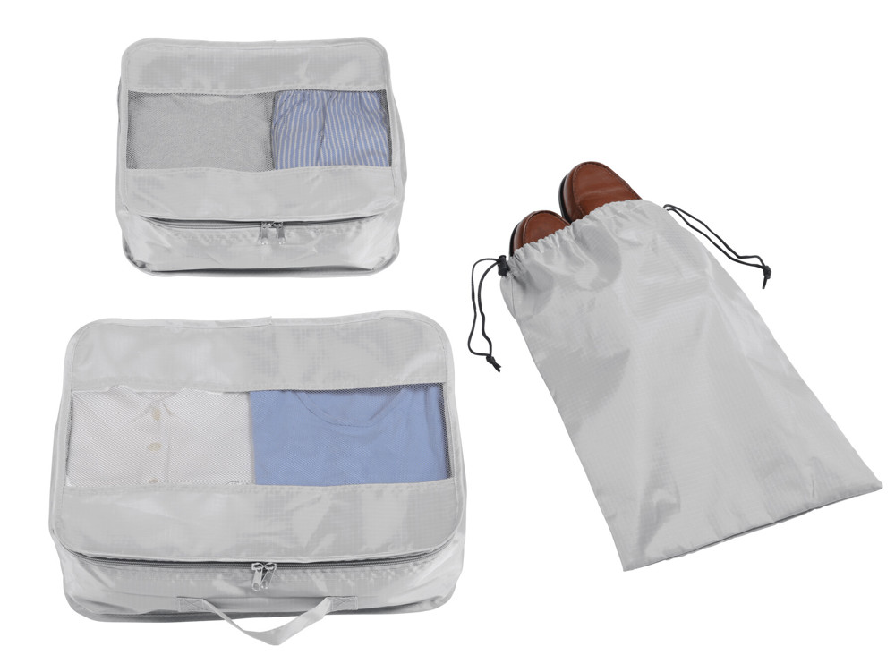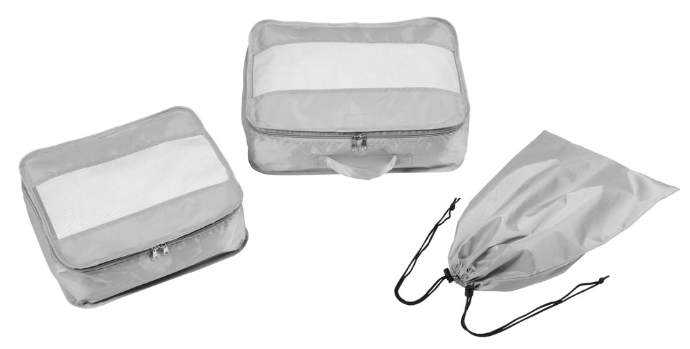 Travel kit TRAVEL ATTENDANT, 3 pieces: composed of 2 clothing bags in different sizes and 1 shoe bag, clothing bags with net-woven window for ventilation and easily seeing inside, double zip, carrying handle on the big bag, shoe bag with drawstring closure and 2 plastic stoppers – for additional tidiness inside the suitcase