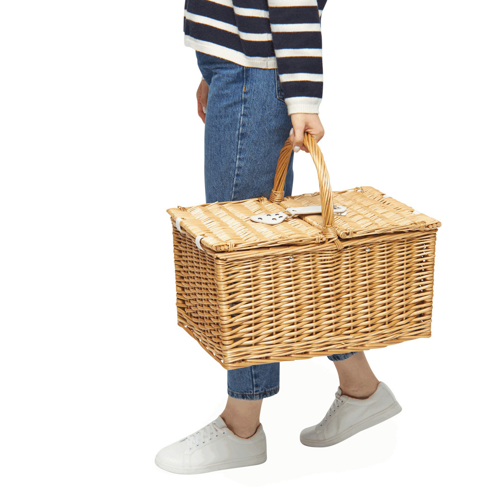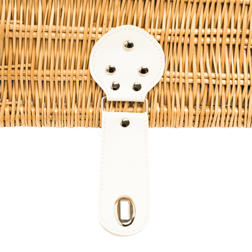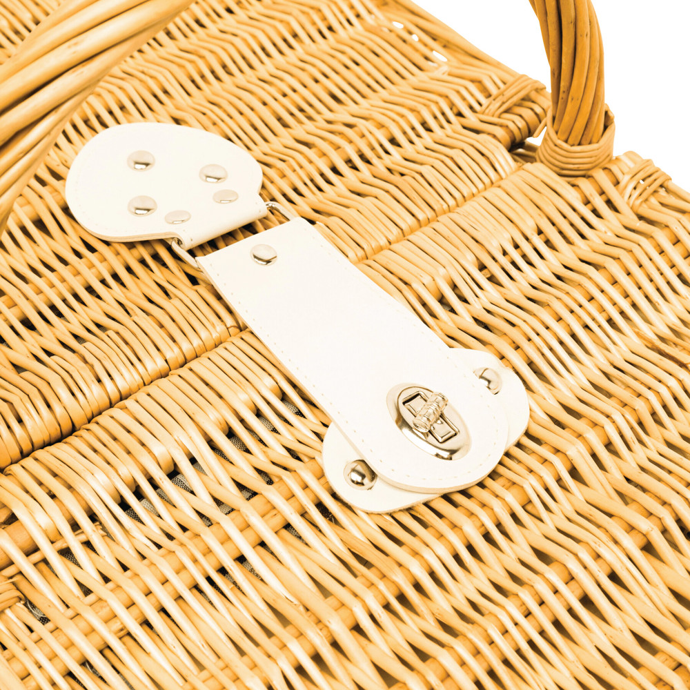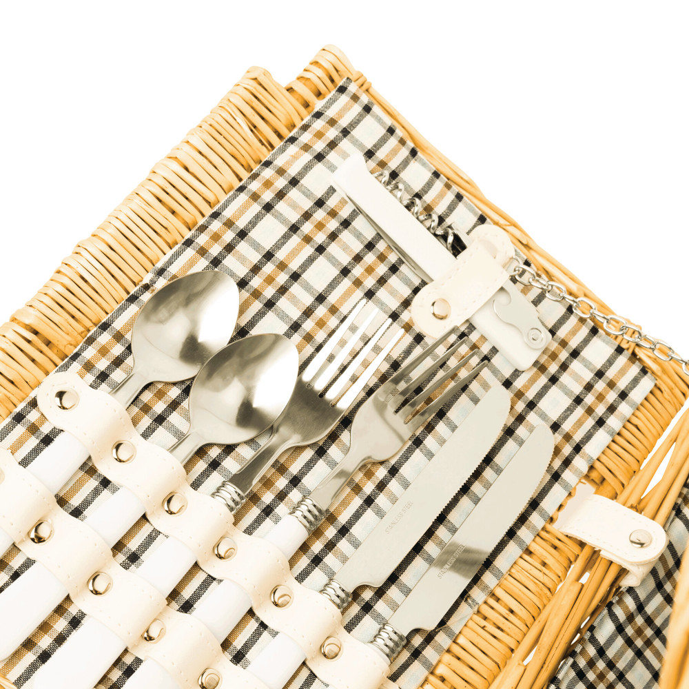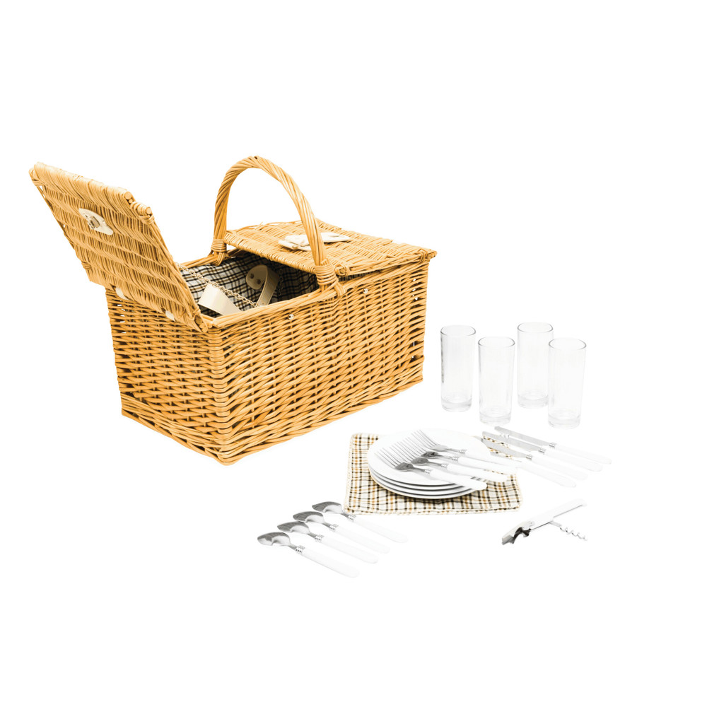 Wicker picnic basket STANLEY PARK for 4 people: incl. stainless steel cutlery with plastic handles, ceramic plates, glasses, napkins, and a waiter's knife, with fastening straps on the inside, with carrying handle and twist lock