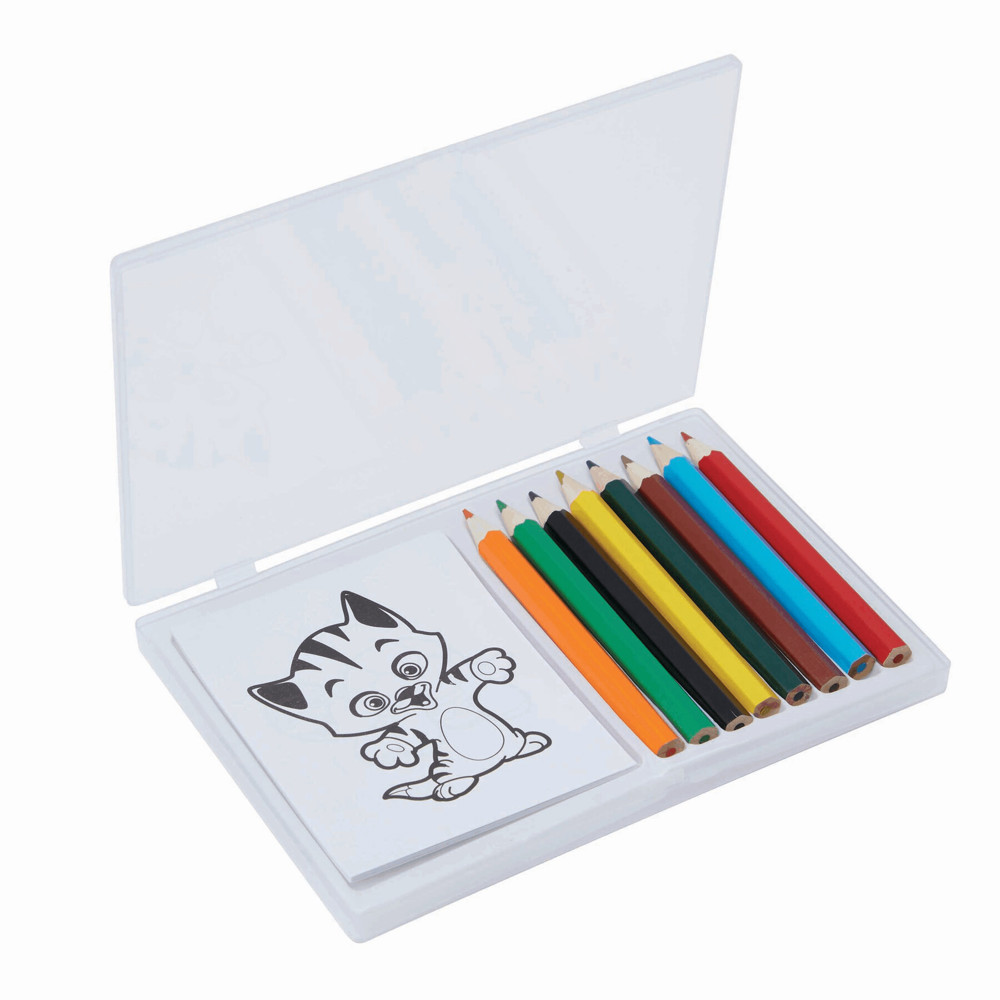 Colouring set CRAZY ANIMALS with 12 colouring pages with different designs to colour in, 8 coloured pencils, sharpened, in transparent box