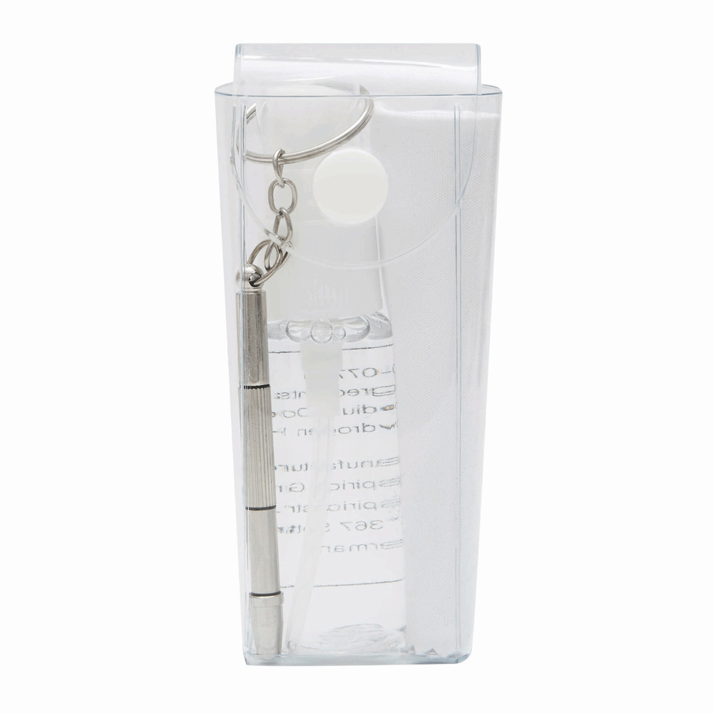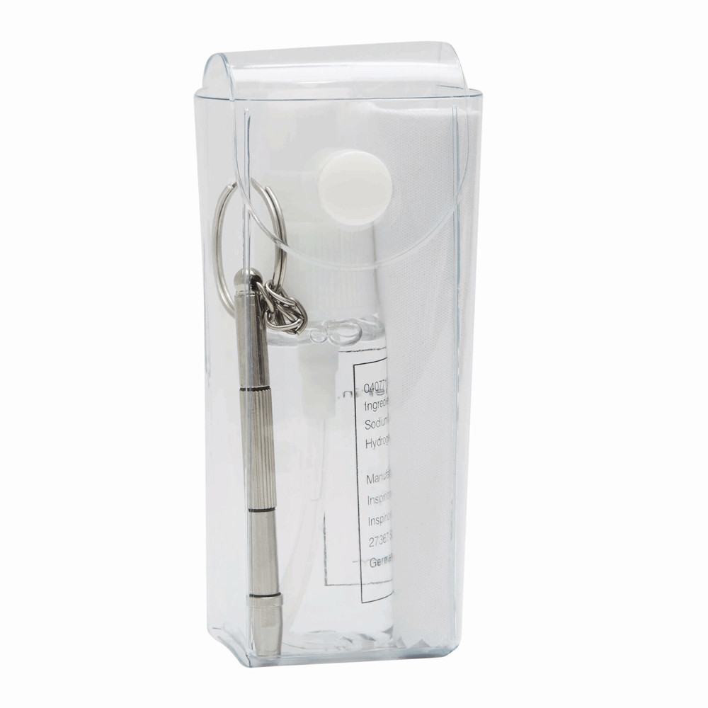 Glass cleaner kit VIEW, spray bottle with cleaning fluid (approx. 20 ml), glass cleaner cloth, mini screwdriver with key ring, in PVC bag with snap fastener
