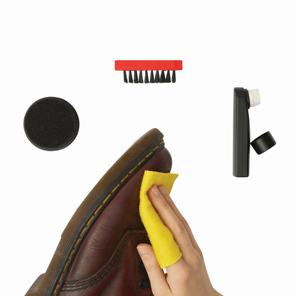 Shoe cleaning kit SMALL SHINE: composed of wooden brush, polishing cloth (approx. 23 x 10 cm), colourless shoe oil with sponge for application, sponge with colourless silicone oil, inside transparent bag with zip