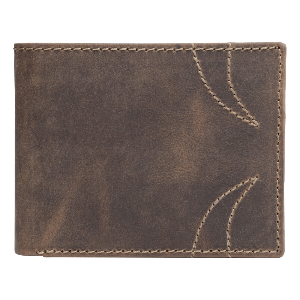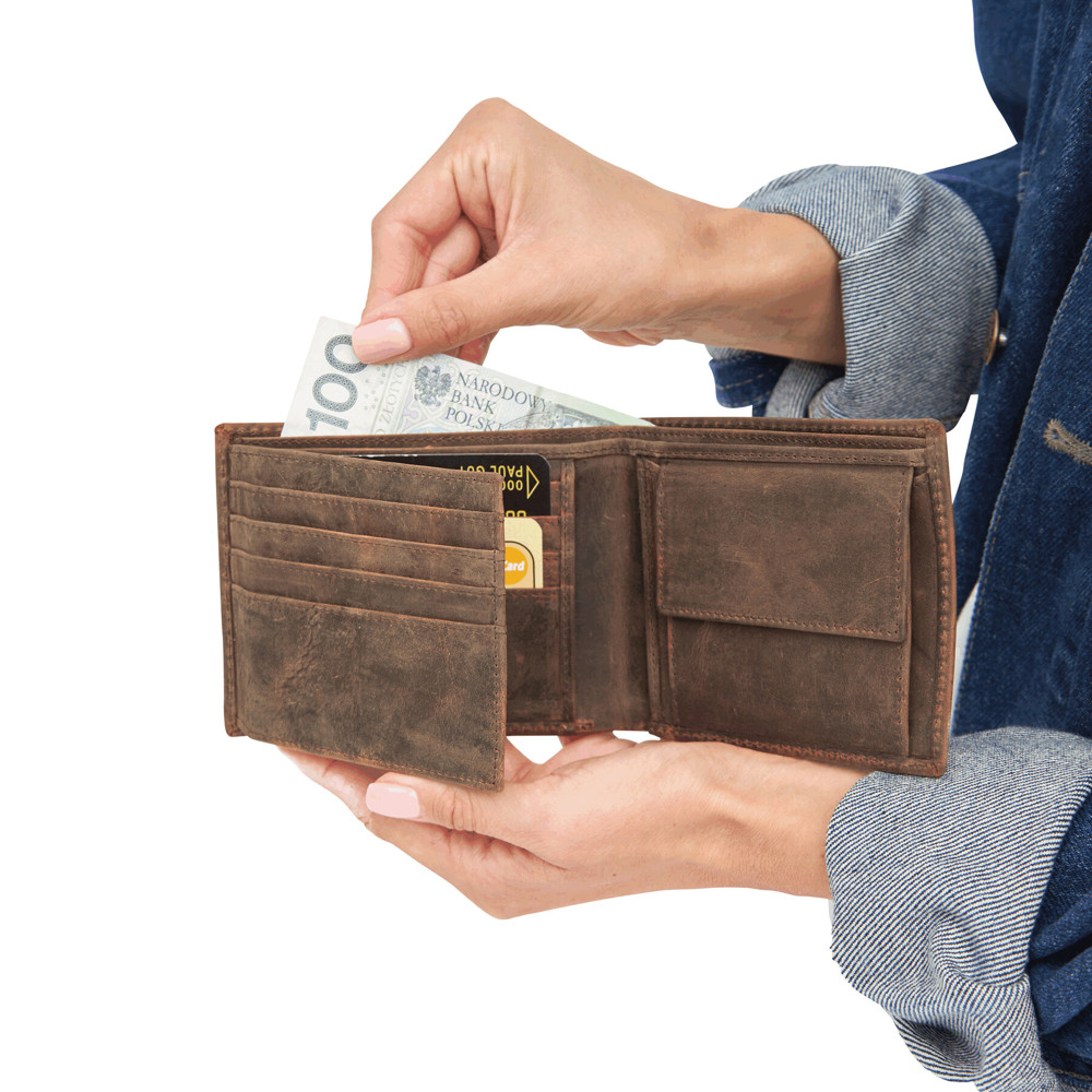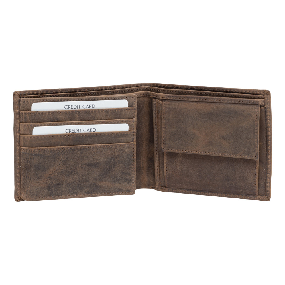 Genuine leather wallet WILDERNESS I: 8 slip-in pockets for credit cards, 2 pockets for banknotes, 1 coin pocket with press stud closure, 1 mesh pocket for ID and driving licence, 2 additional pockets