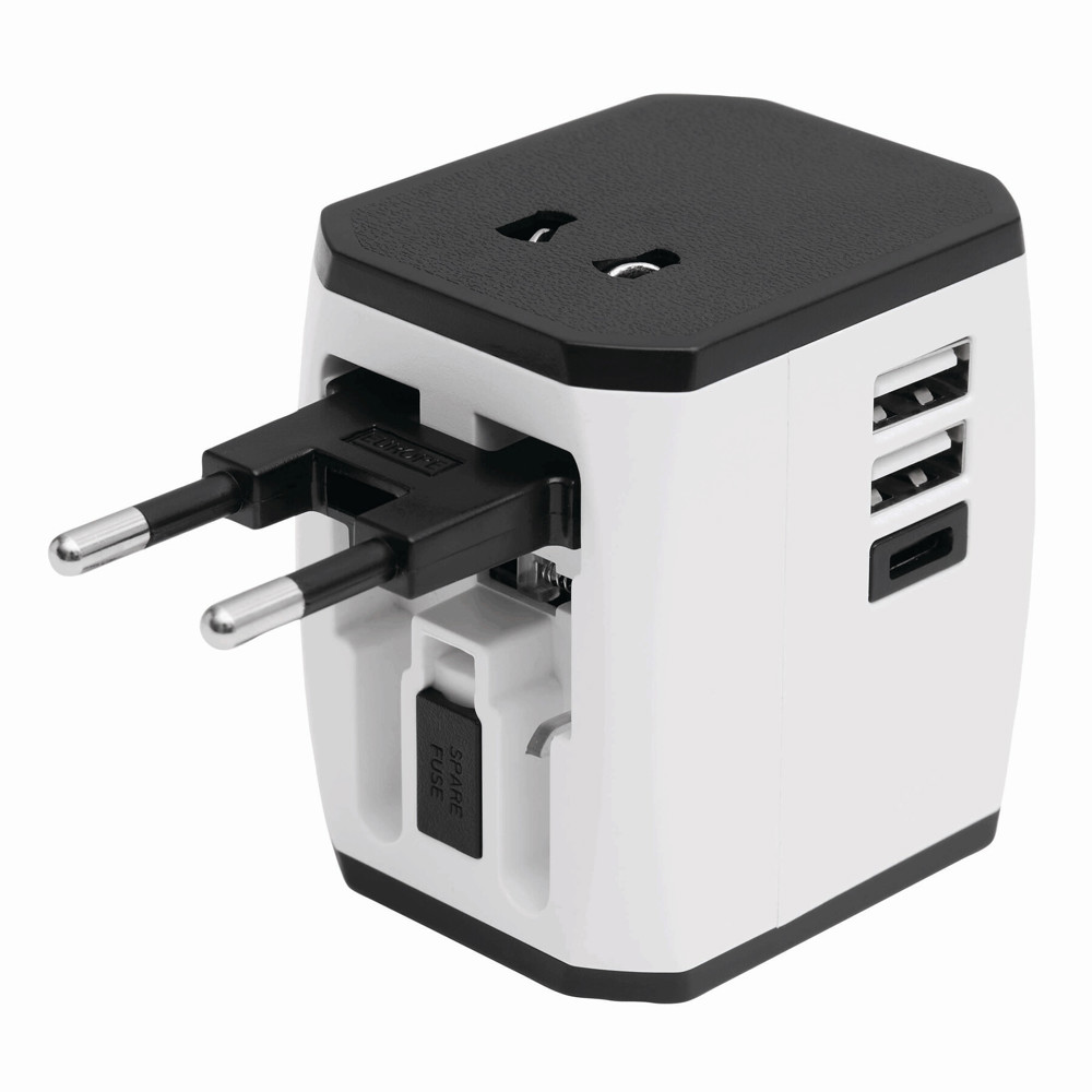 Travel adapter TRAVEL POWER: with switching controller for UK, Europe, USA, Australia, and Asia (not suitable for Switzerland), fold-out plugs, 3 USB charging ports (2 ports USB A and 1 port USB Type-C, total output capacity max. 2,4 A) for e.g. smartphones, tablets, etc., to be used only for non-earthed units