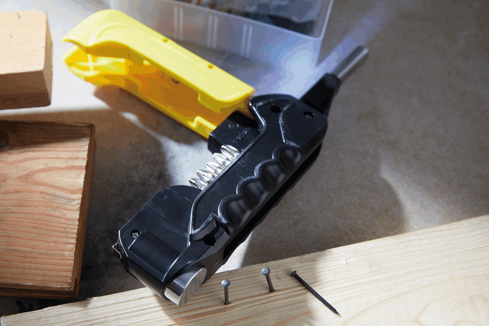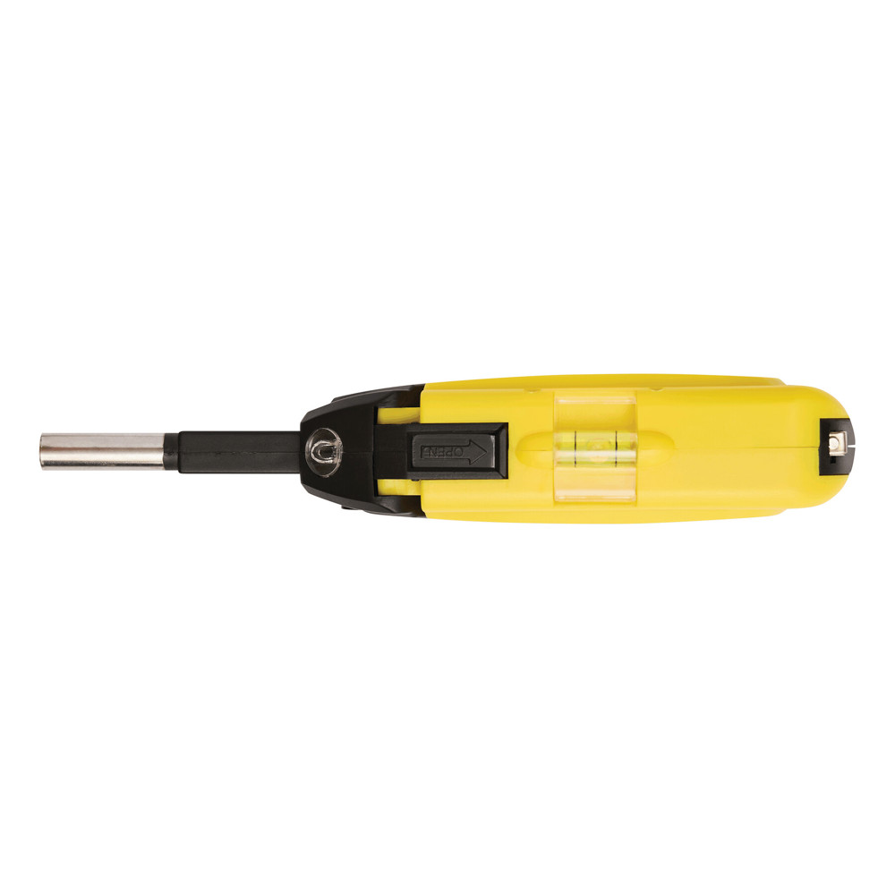 Multi-tool HINGED with 17 application possibilities: spirit level, fold-out screwdriver with 12 different bits, LED light, measuring tape 1 m, hammer, in gift box