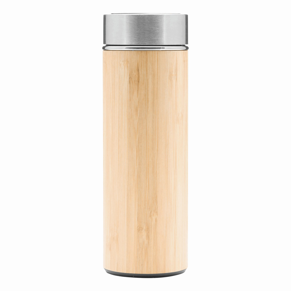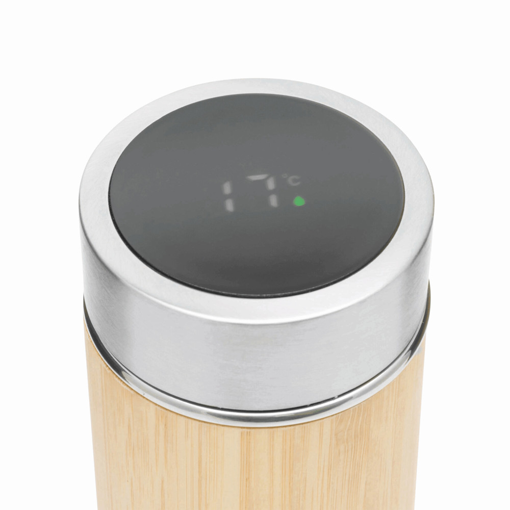 Insulated travel mug BAMBOO TEMP, double-walled: inside and outside made of stainless steel, outside covered in bamboo, secure screw-on lid with silicone sealing ring and integrated digital thermometer, with detachable strainer, capacity approx. 400 ml