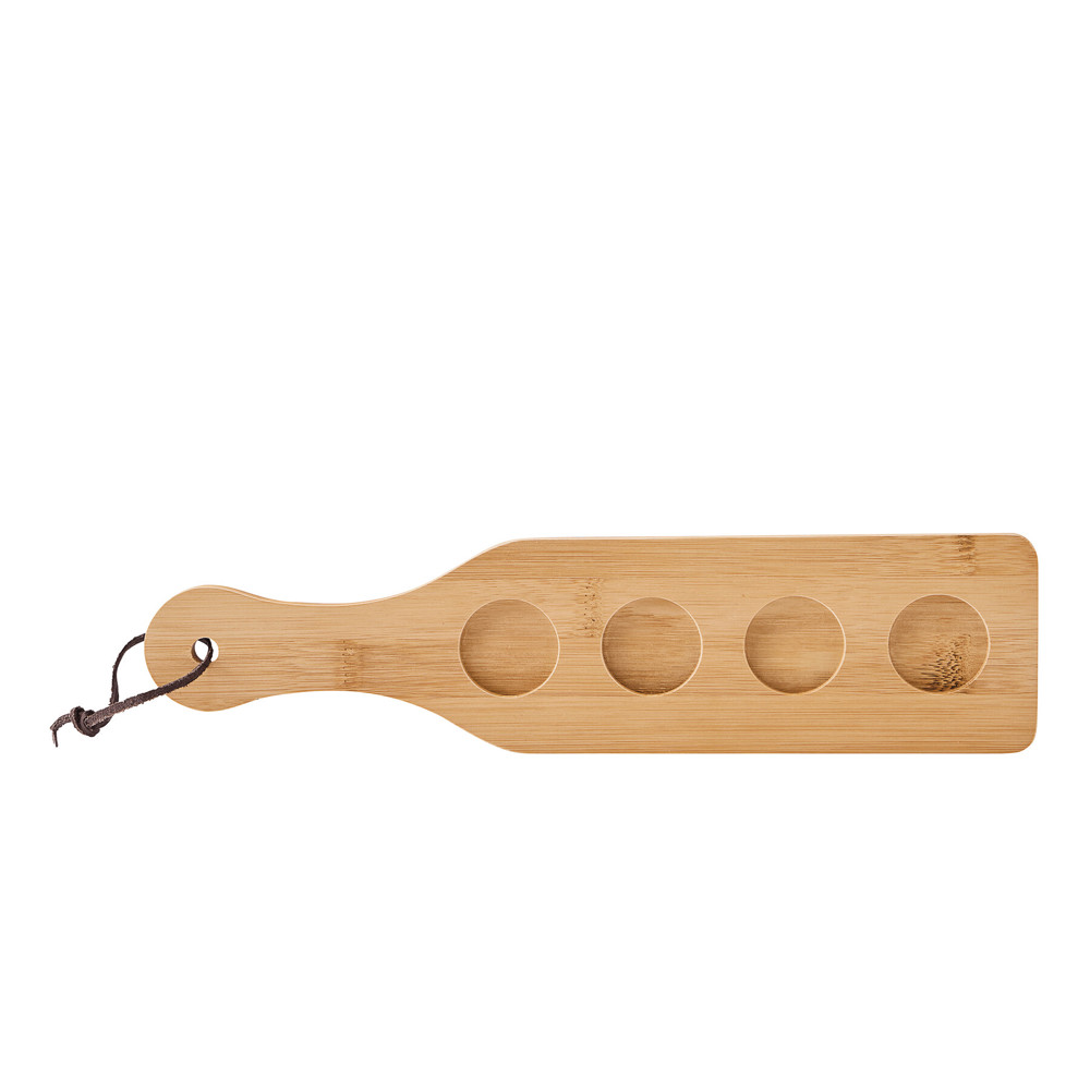 Tray with shot glasses BAMBOO PARTY: 4 shot glasses (6 cl each) on a wooden bamboo board, glasses fit securely in indentations on the tray, with leather tie for suspension