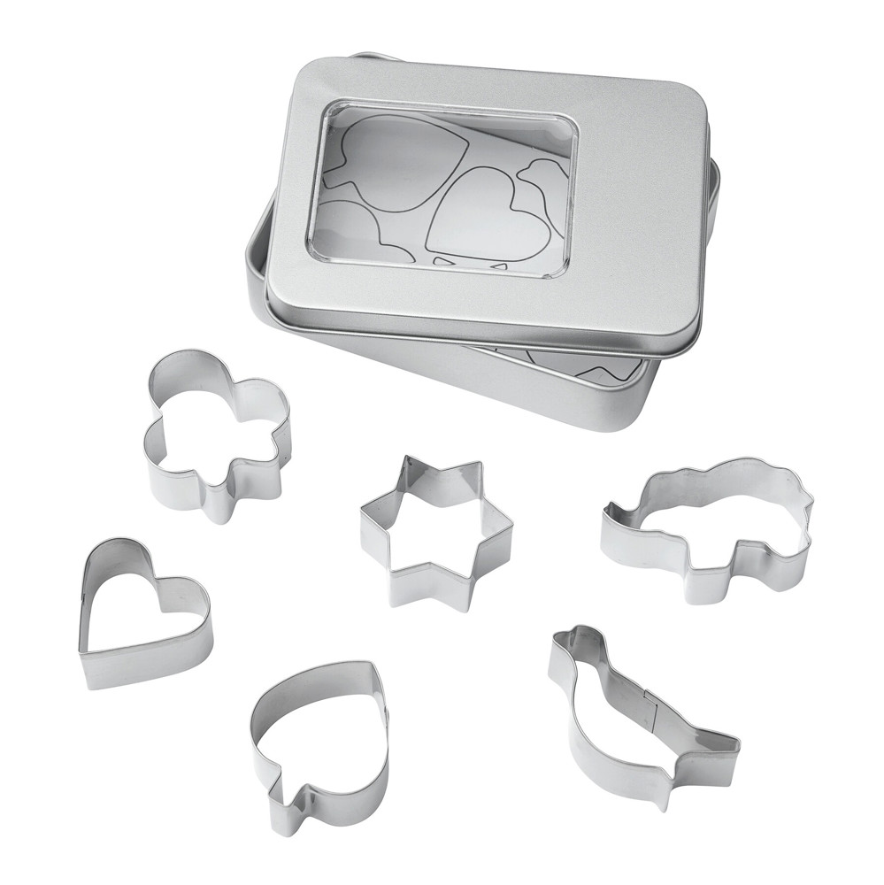 Cookie cutter set COOKIE BOX: with 6 differently themed rustproof stainless steel cutters – ideal for baking cookies, delivered in a stainless steel box with viewing window