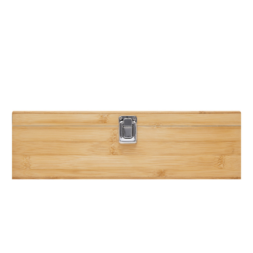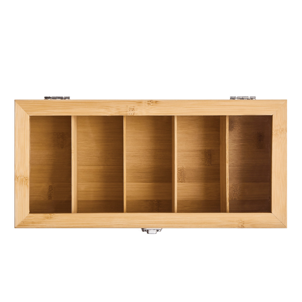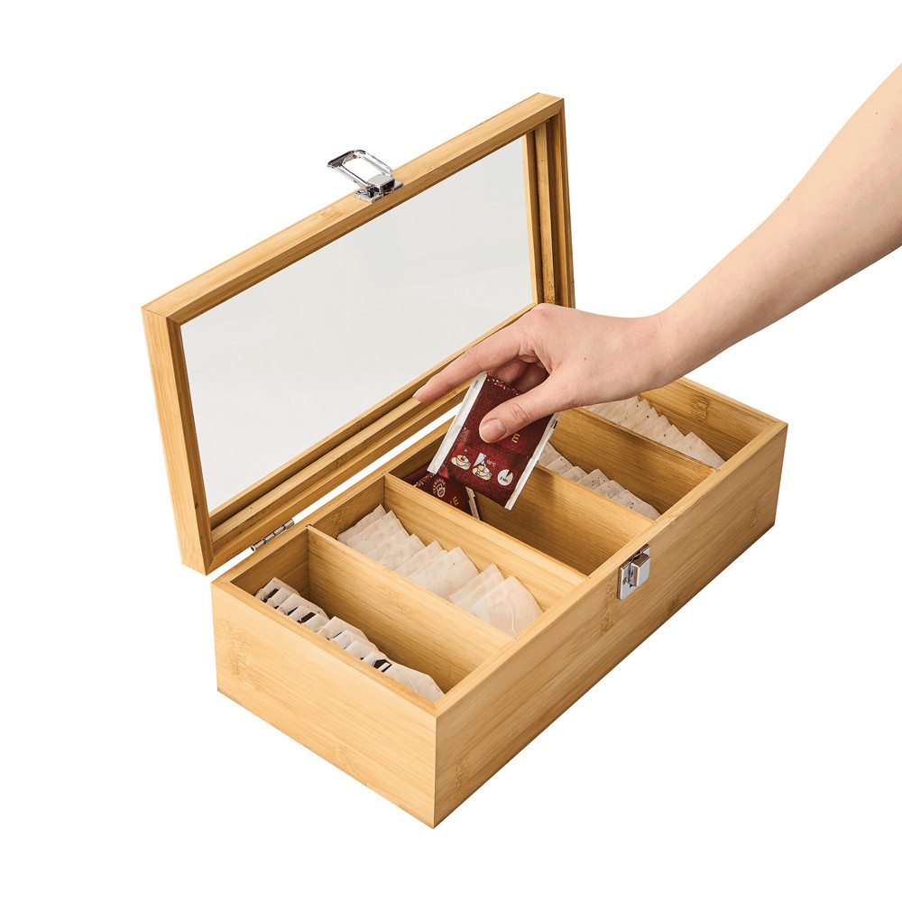 Tea box TEA LOUNGE: with 5 separate compartments for tea bags, with glass lid and snap latch, made of bamboo