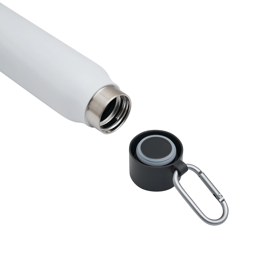 Vacuum drinking bottle ALPINE PEAK, double-walled: inside made of recycled stainless steel, outside made of stainless steel, plastic lid with secure screw cap, silicone sealing ring, and carabiner (the carabiner is NOT suitable for climbing), capacity approx. 550 ml, keeps warm for approx. 8 hours and cold for up to 12 hours, in a box