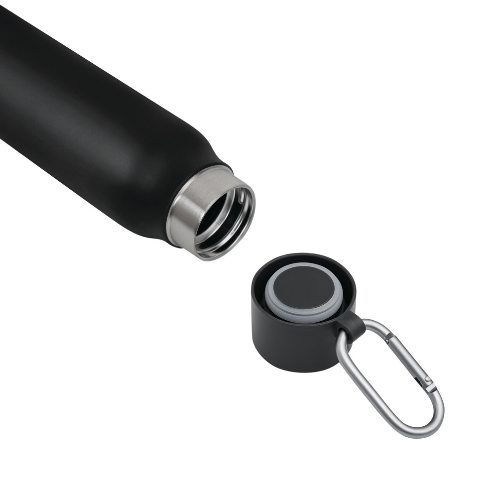 Vacuum drinking bottle ALPINE PEAK, double-walled: inside made of recycled stainless steel, outside made of stainless steel, plastic lid with secure screw cap, silicone sealing ring, and carabiner (the carabiner is NOT suitable for climbing), capacity approx. 550 ml, keeps warm for approx. 8 hours and cold for up to 12 hours, in a box