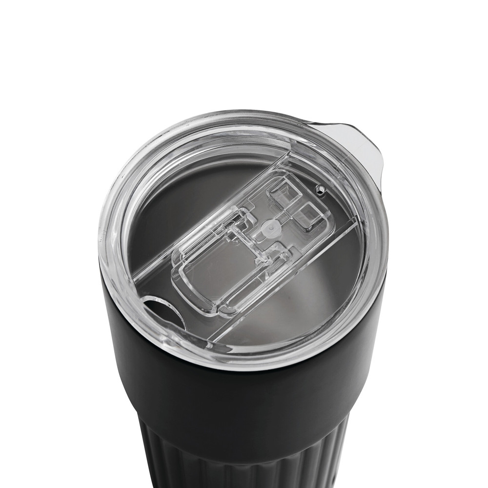 Vacuum drink mug WAVE LINE, double-walled: inside made of recycled stainless steel, outside made of stainless steel, plastic lid with silicone sealing ring and integrated sliding drinking opening, capacity approx. 600 ml, keeps warm for approx. 4 hours and cold for up to 8 hours, in a box
