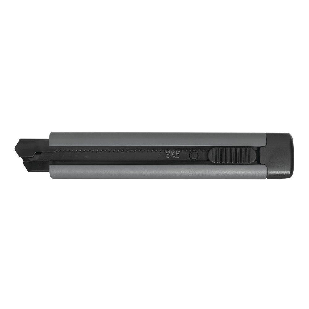 Cutter knife RELIABLE: with flexible black 18 mm snap-off blade (10 blade segments and 2 spare blades), auto-stop slider, plastic casing, and steel blade guide, for light to heavy cutting, in a box