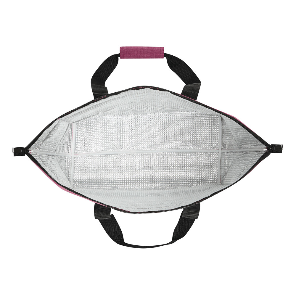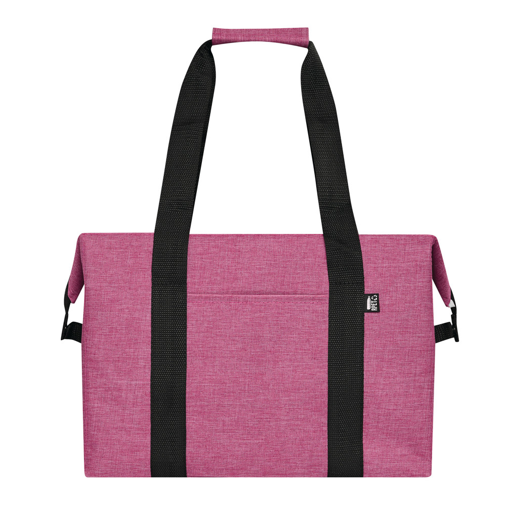 Cooler bag POLAR: made of recycled plastic (RPET), insulated main compartment with 2-way zip, 1 slip-in pocket on the front, reinforced carrying handles, expandable storage space by unsnapping top edges of the bag from the webbing loop attached at each side