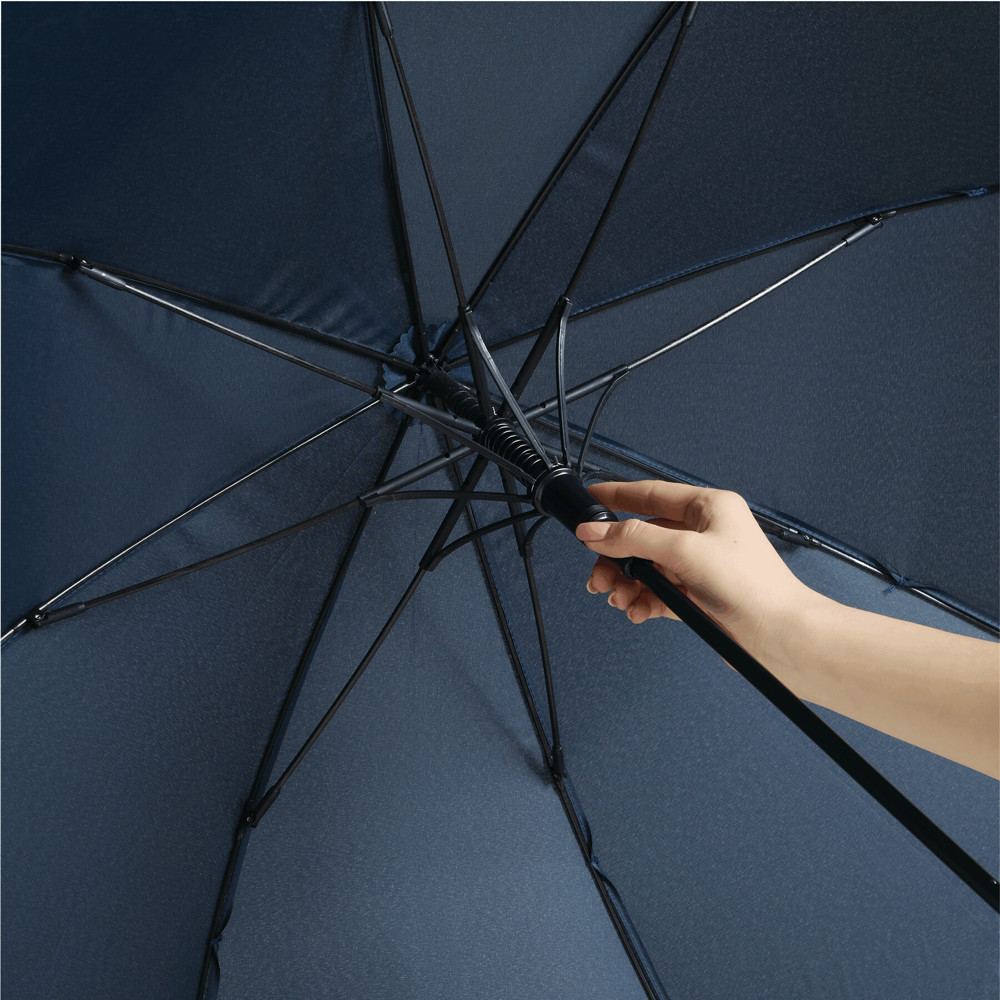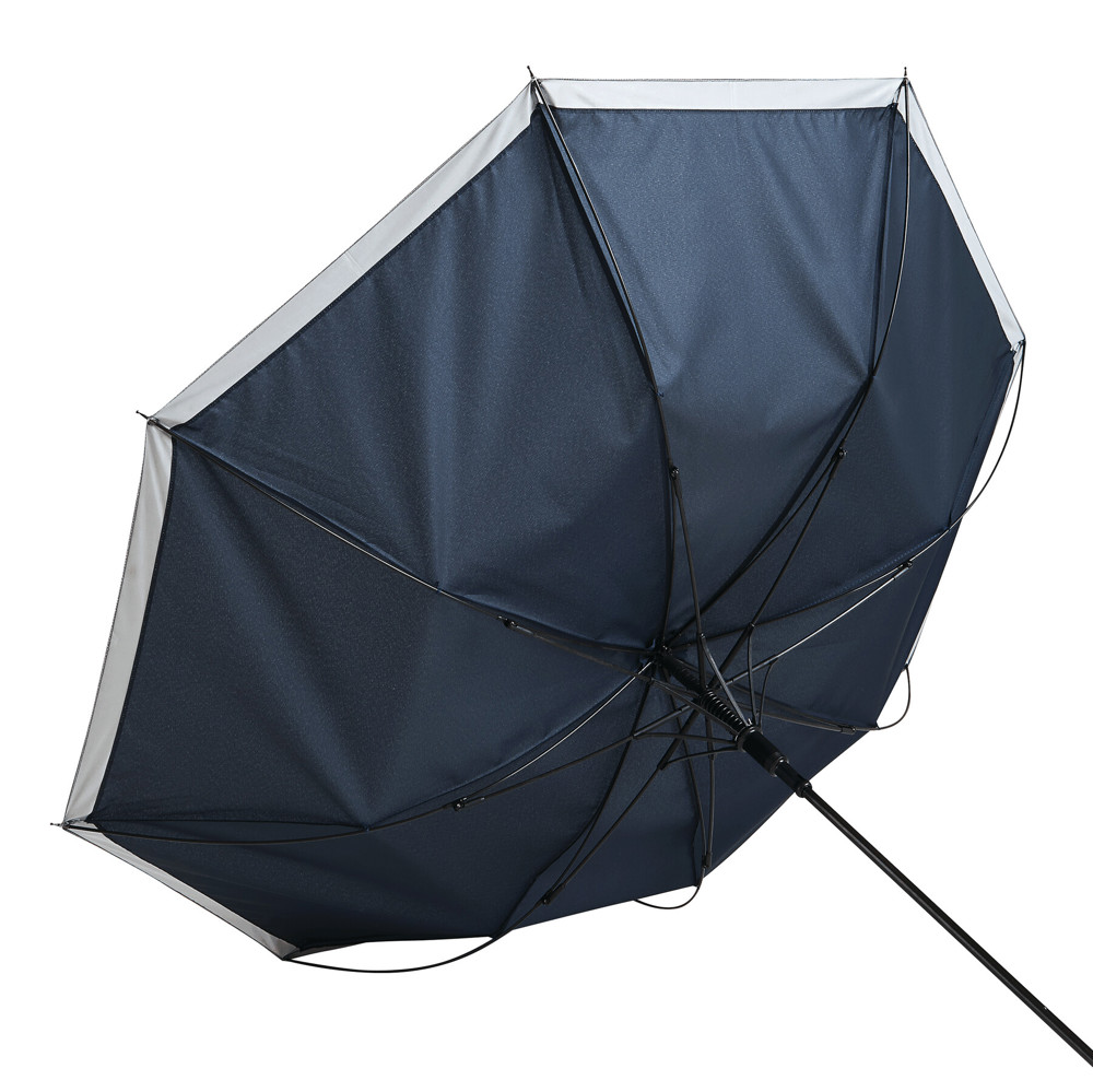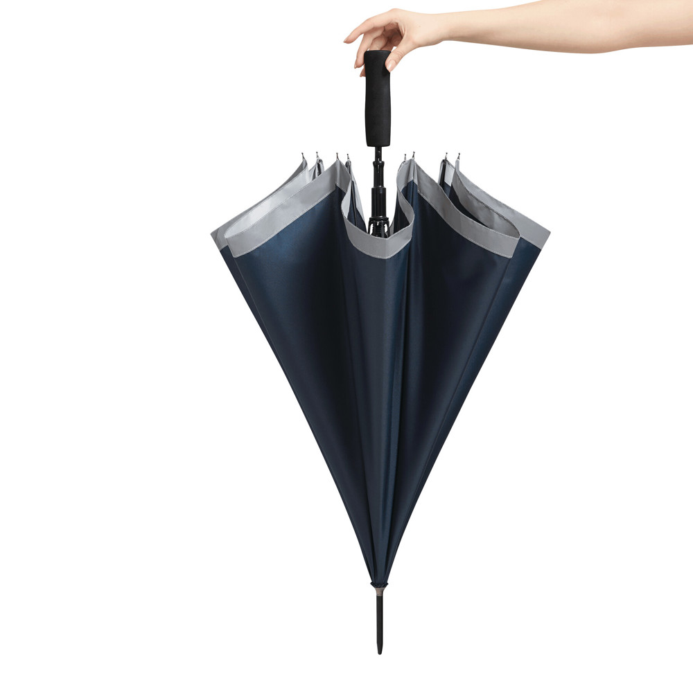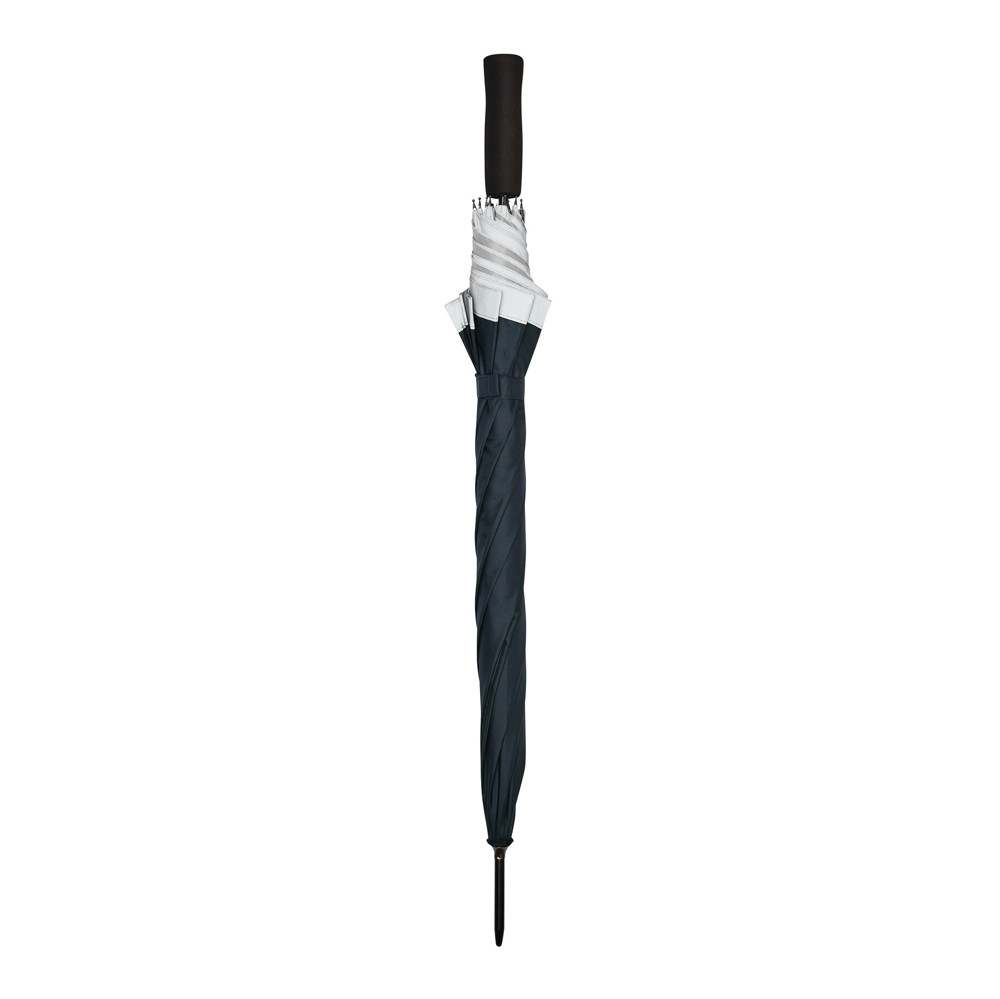 Automatic stick umbrella CALIMA: metal shaft, fibreglass ribs, and metal tips, EVA handle, polyester pongee canopy made from recycled plastic / rPET, with silver reflecting stripe, closure with Velcro