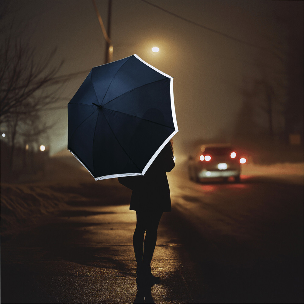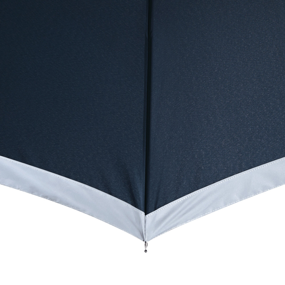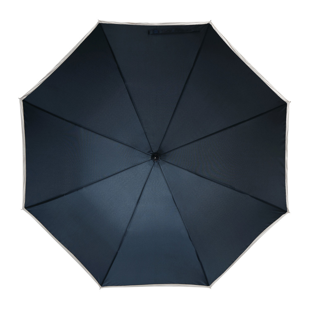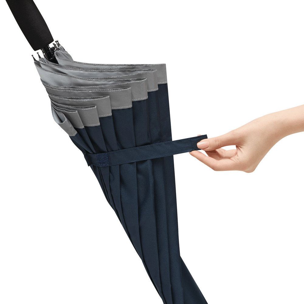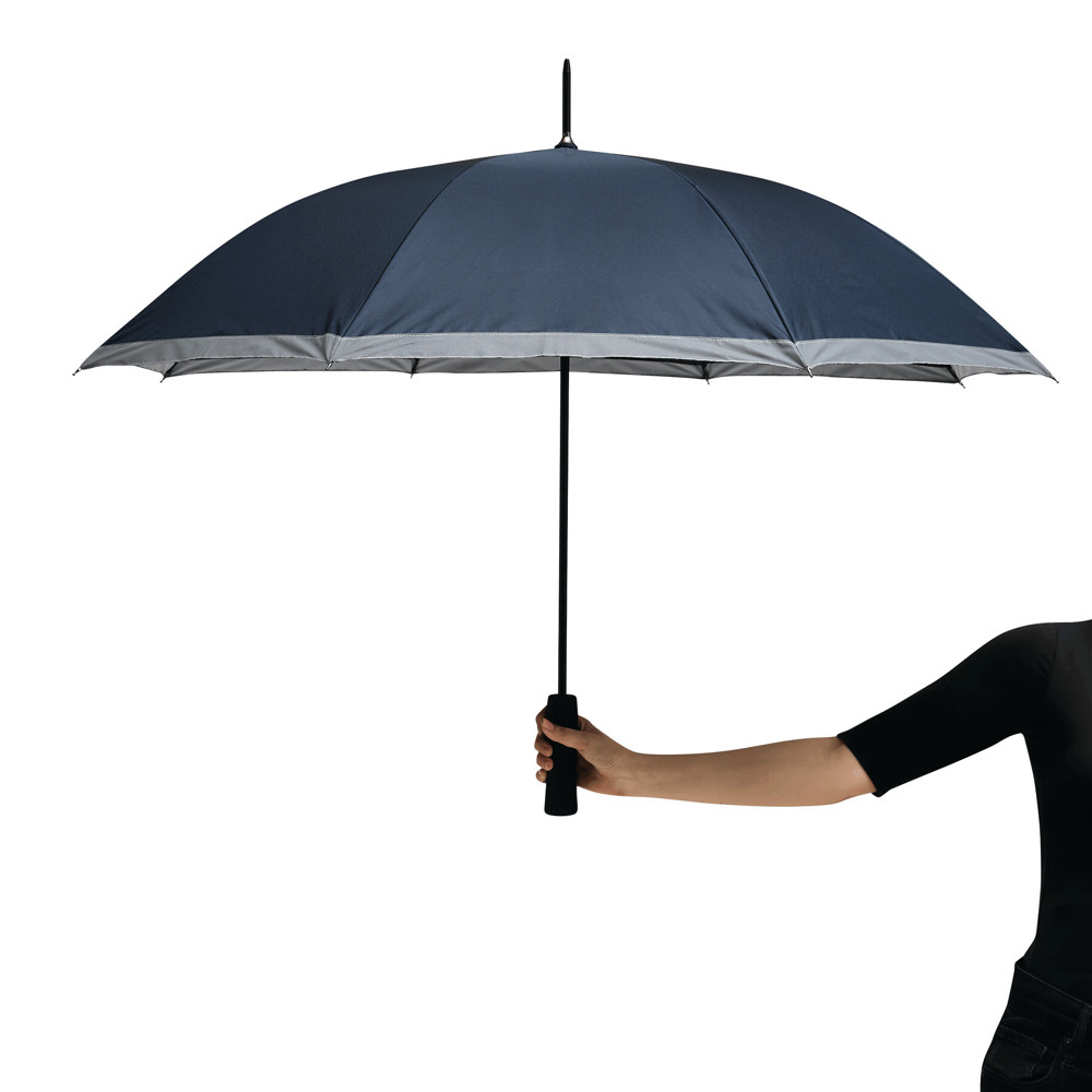 Automatic stick umbrella CALIMA: metal shaft, fibreglass ribs, and metal tips, EVA handle, polyester pongee canopy made from recycled plastic / rPET, with silver reflecting stripe, closure with Velcro