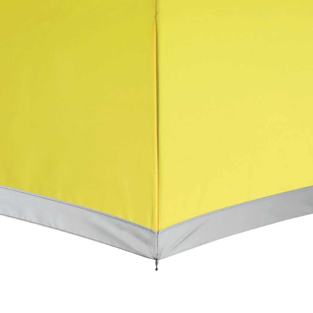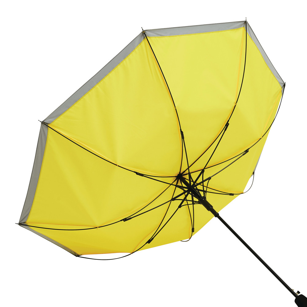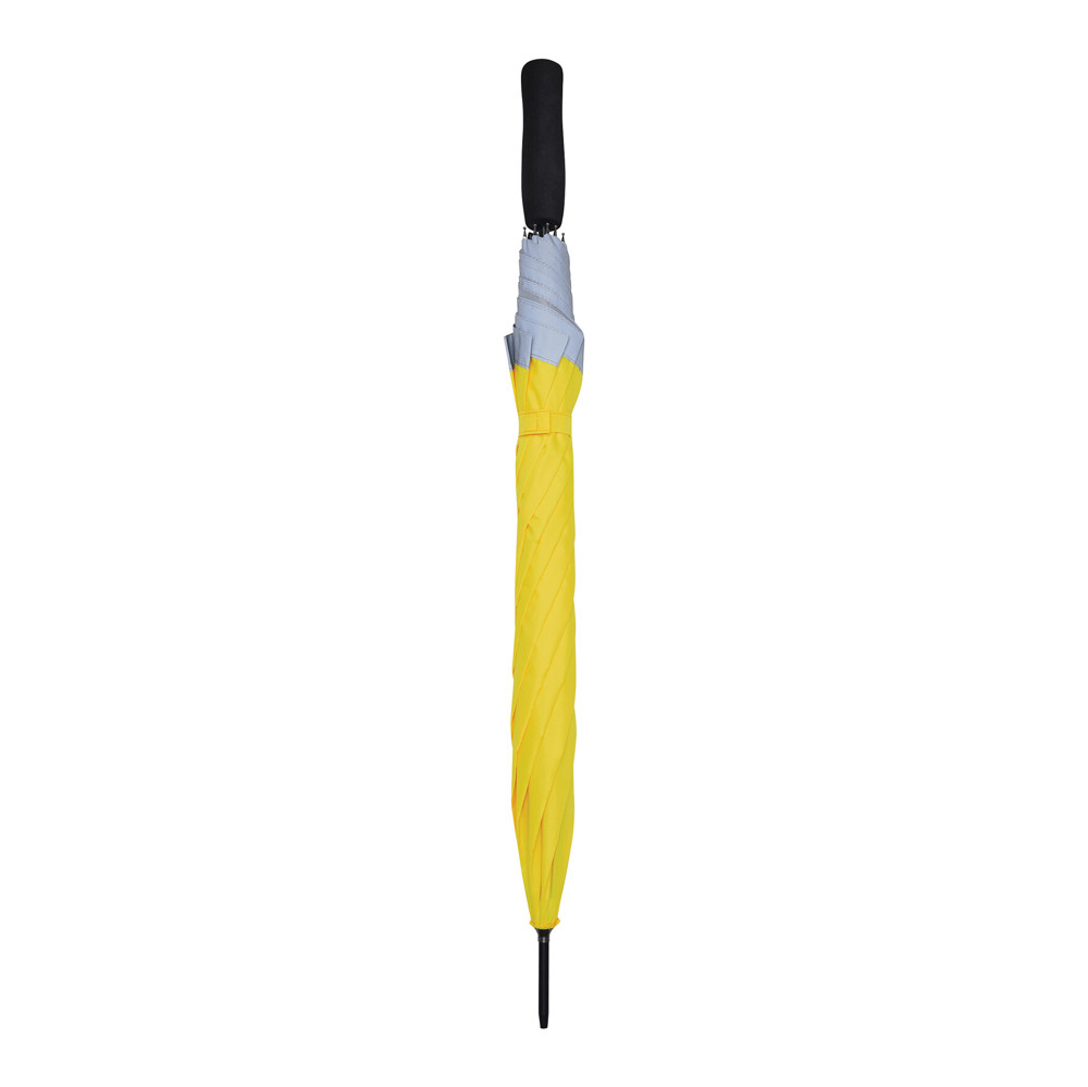 Automatic stick umbrella CALIMA: metal shaft, fibreglass ribs, and metal tips, EVA handle, polyester pongee canopy made from recycled plastic / rPET, with silver reflecting stripe, closure with Velcro