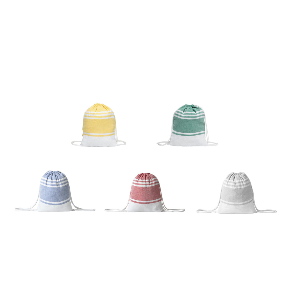 Large beach/sauna towel SUN & STEAM: large towel with white stripes and fringes, in colour-matching bag with drawstring