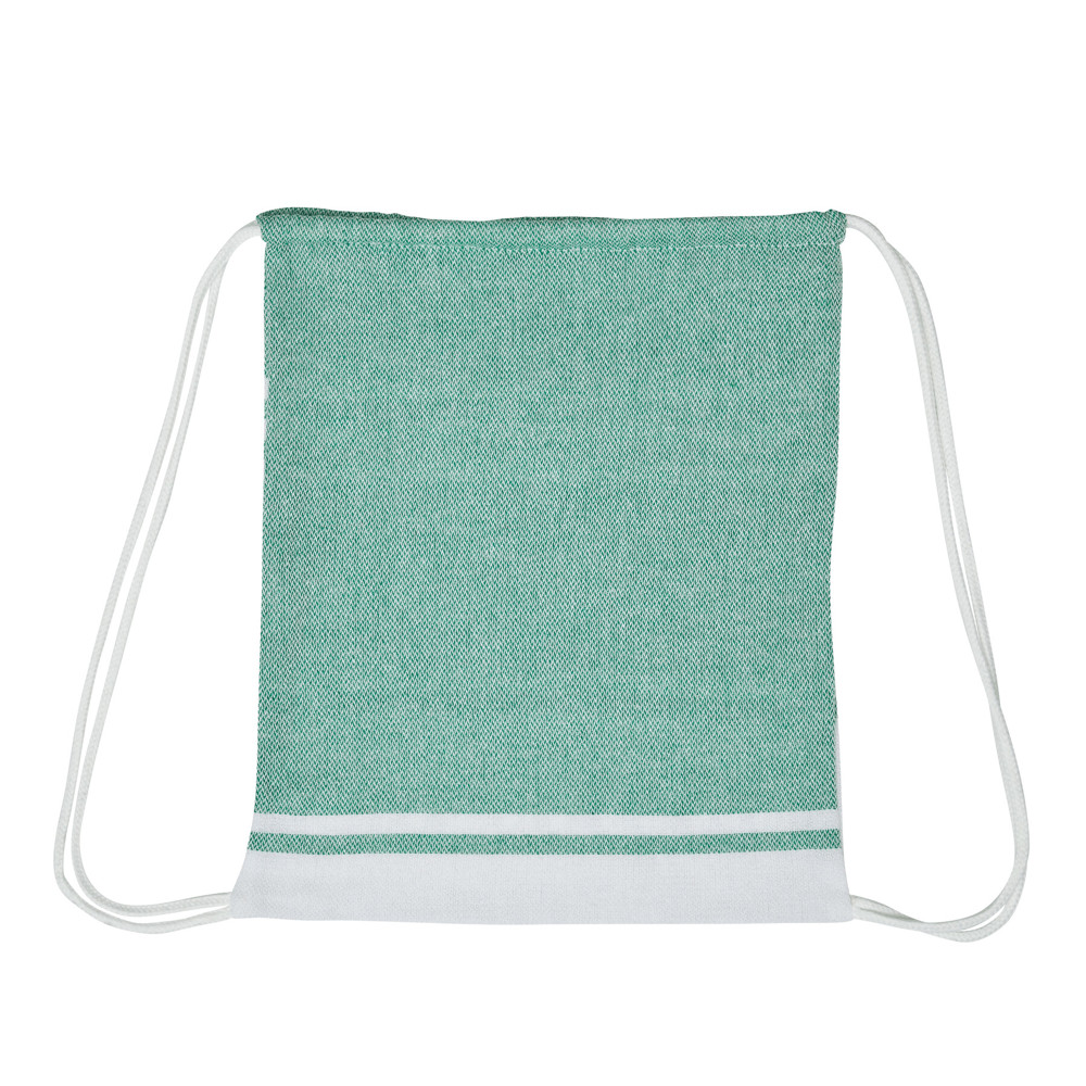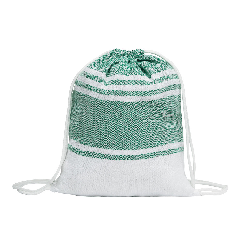 Large beach/sauna towel SUN & STEAM: large towel with white stripes and fringes, in colour-matching bag with drawstring