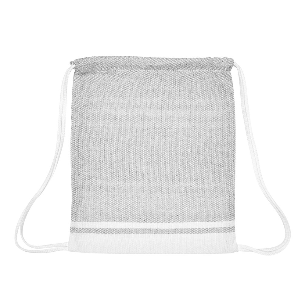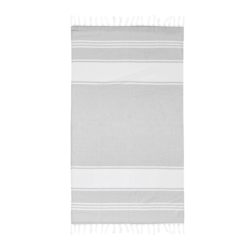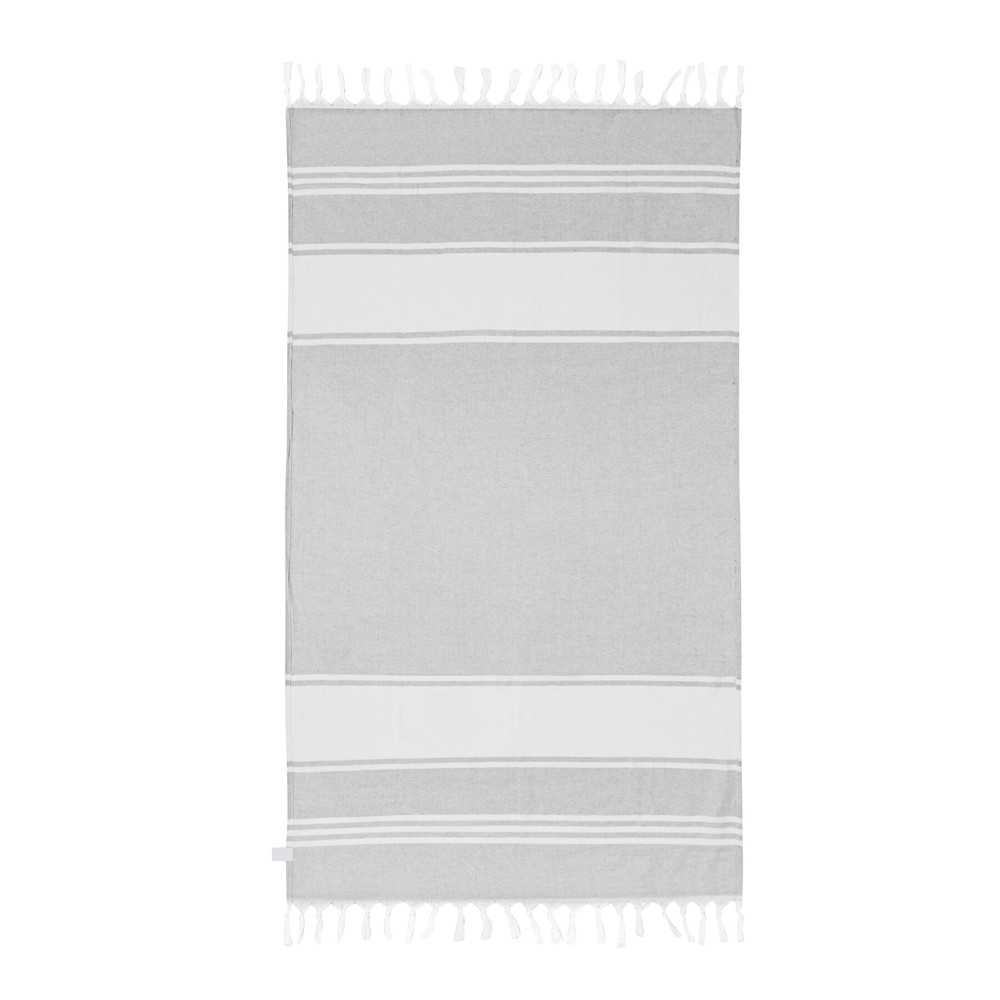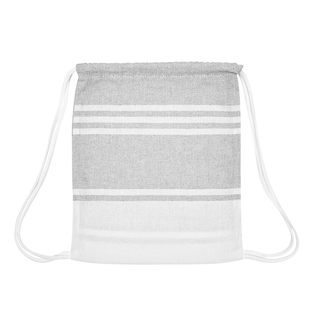 Large beach/sauna towel SUN & STEAM: large towel with white stripes and fringes, in colour-matching bag with drawstring