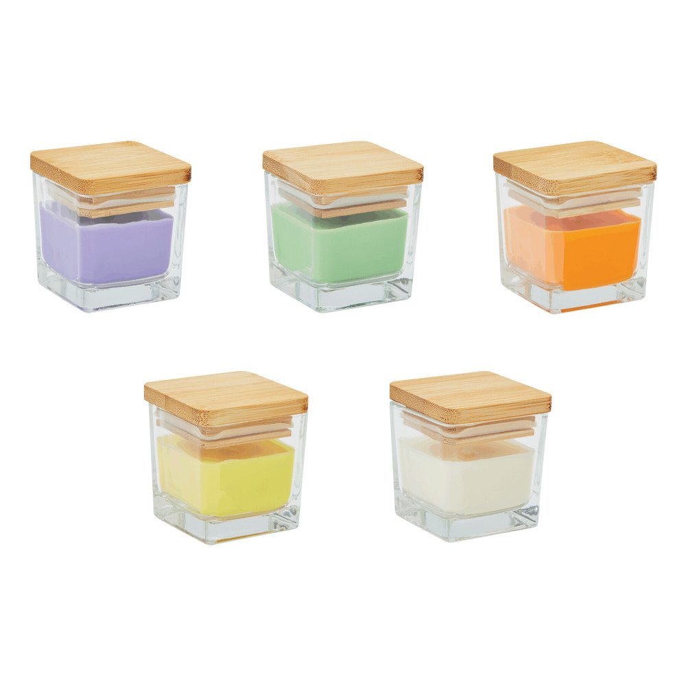 Scented candle GLOW: in square glass, coloured wax with vanilla fragrance, bamboo lid with silicone sealing ring, burns for approx. 8 hours