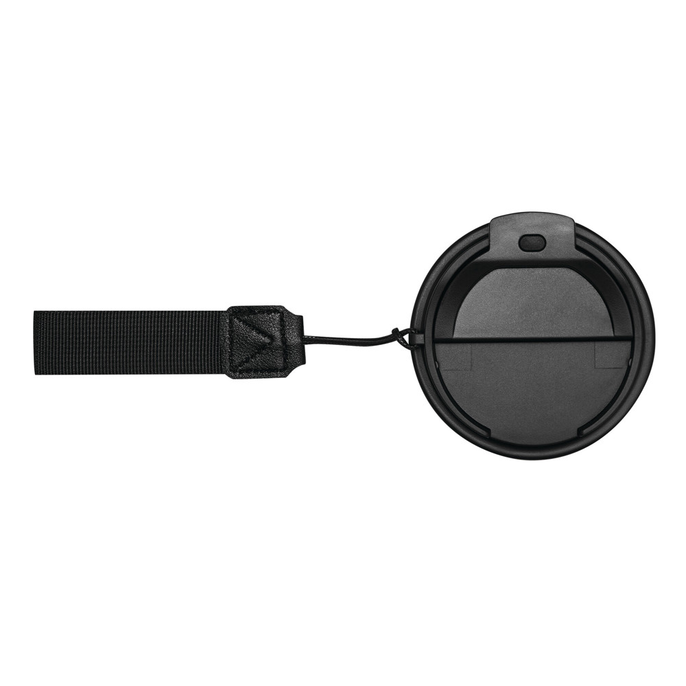 Insulated mug TRAVEL MUG, double-walled: inside and outside made of stainless steel, matte powder coating, plastic lid with secure screw cap, silicone seal, and integrated drinking opening, capacity approx. 400 ml, wrist strap made from recycled plastic