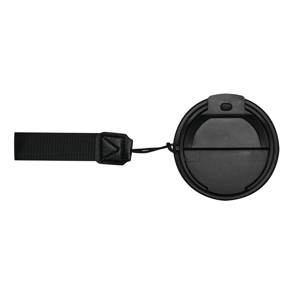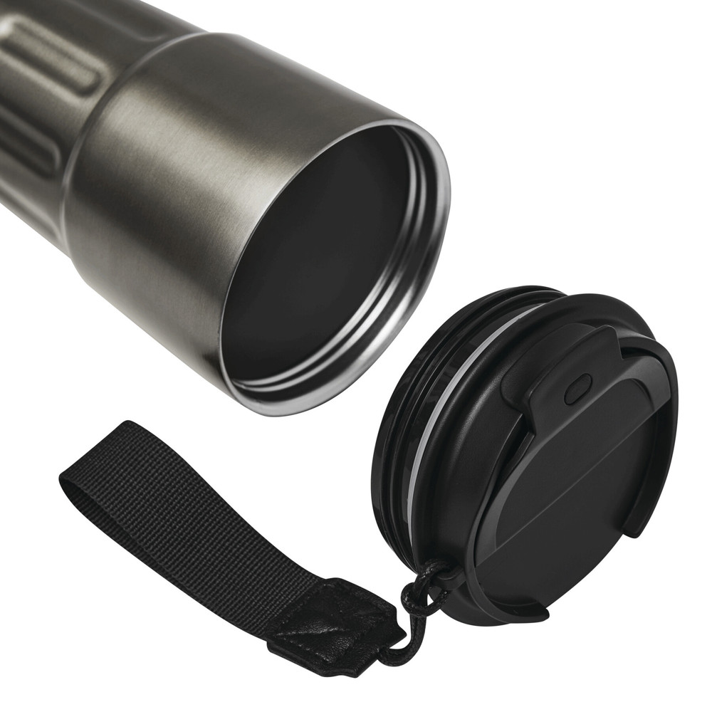 Insulated mug TRAVEL MUG, double-walled: inside and outside made of stainless steel, matte powder coating, plastic lid with secure screw cap, silicone seal, and integrated drinking opening, capacity approx. 400 ml, wrist strap made from recycled plastic