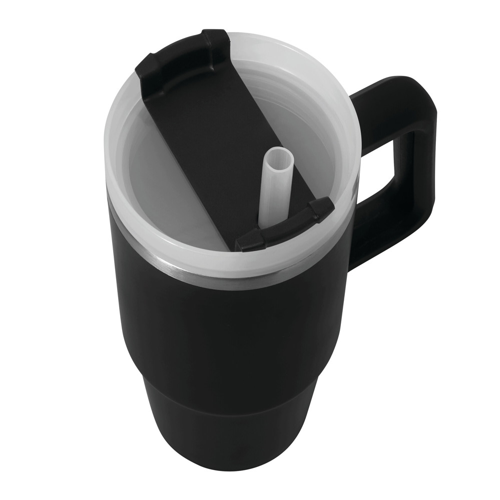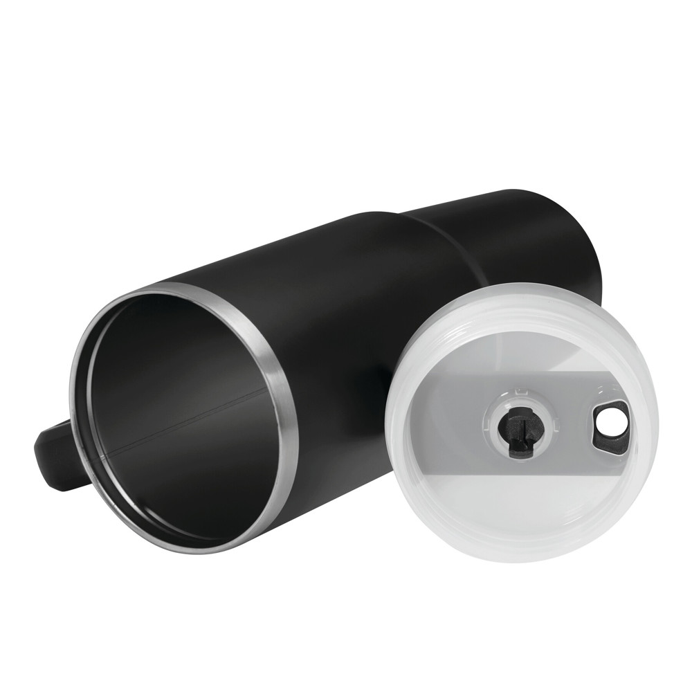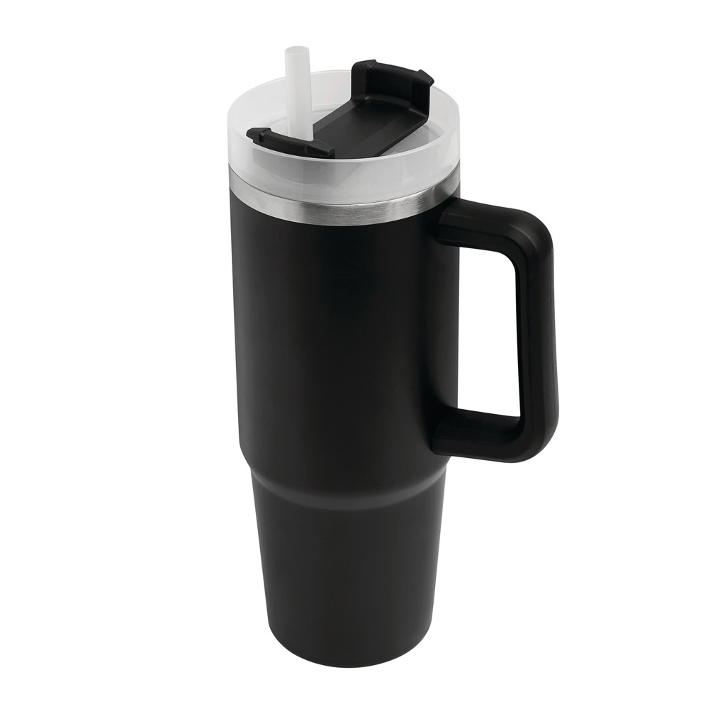 Vacuum drinking cup DRINK DELUXE, double-walled: inside and outside made of stainless steel, with practical handle, semi transparent plastic lid with secure screw cap, silicone sealing ring, drinking opening with rotating cover and transparent straw, capacity approx. 900 ml