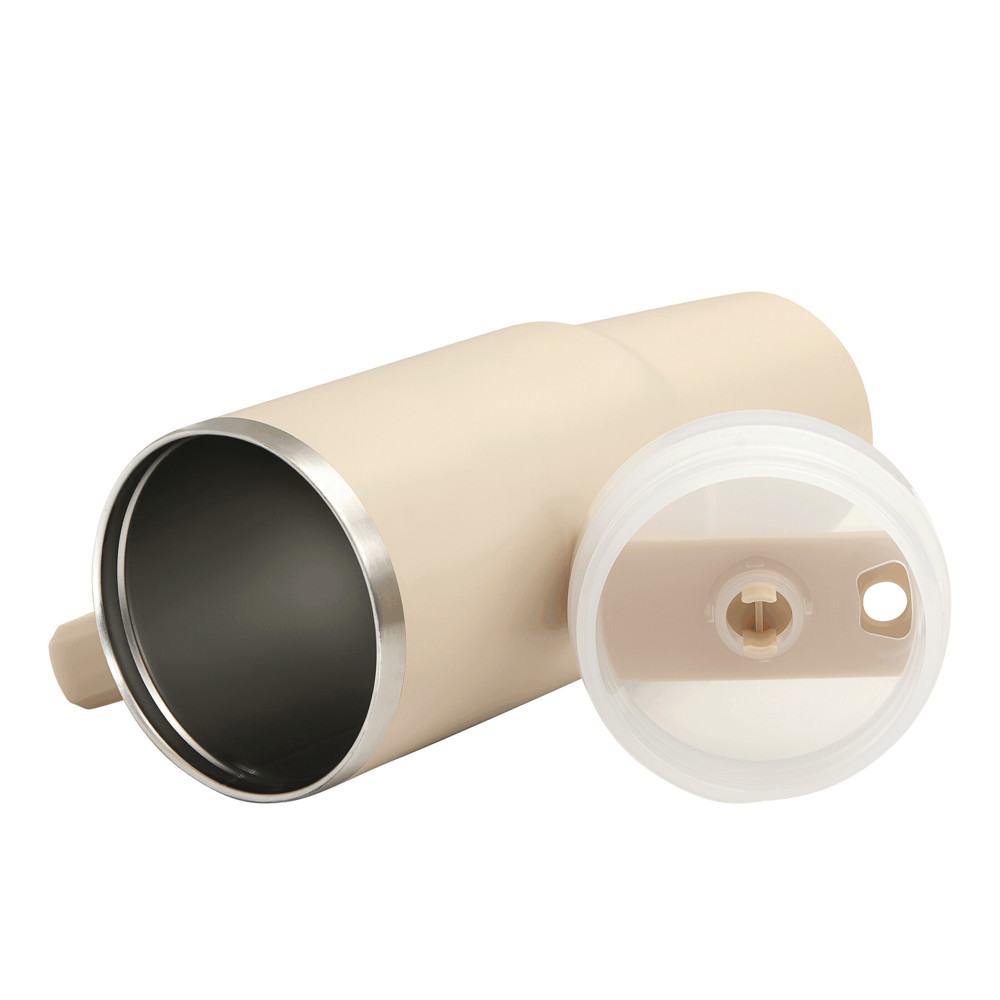 Vacuum drinking cup DRINK DELUXE, double-walled: inside and outside made of stainless steel, with practical handle, semi transparent plastic lid with secure screw cap, silicone sealing ring, drinking opening with rotating cover and transparent straw, capacity approx. 900 ml
