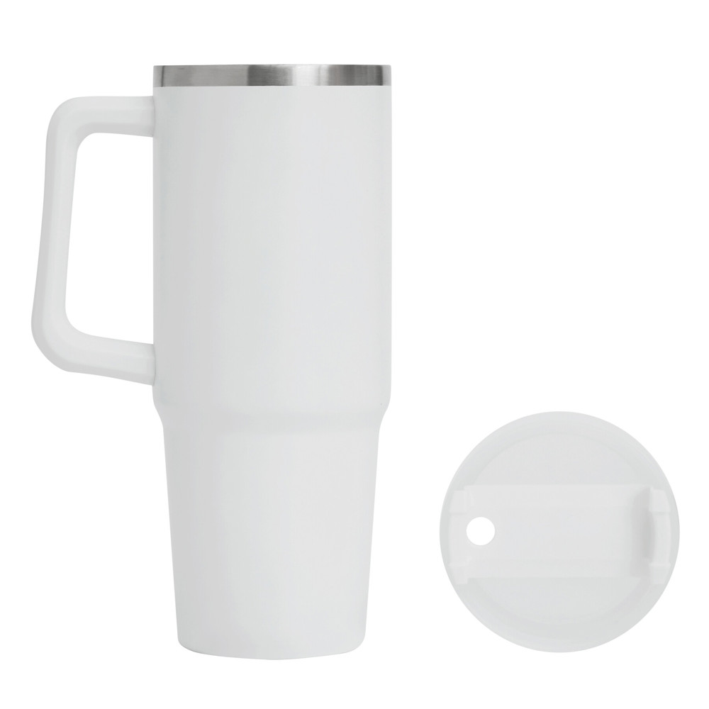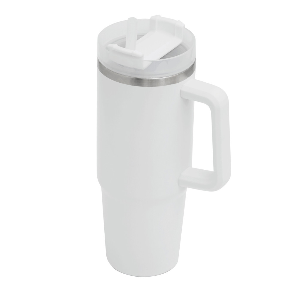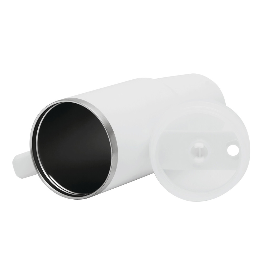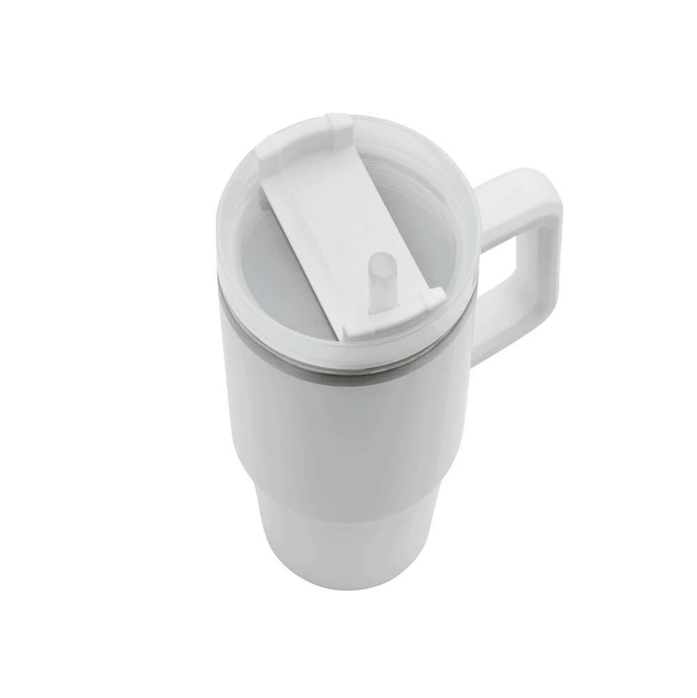 Vacuum drinking cup DRINK DELUXE, double-walled: inside and outside made of stainless steel, with practical handle, semi transparent plastic lid with secure screw cap, silicone sealing ring, drinking opening with rotating cover and transparent straw, capacity approx. 900 ml