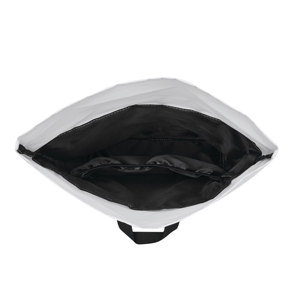 Backpack ROLL-TOP: made from recycled plastic (rPET), zipped front compartment, large main compartment with padded interior compartment for laptop or tablet, top can be rolled up and fastened with snap closure, grab handle, padded bottom, shoulder straps, back panel