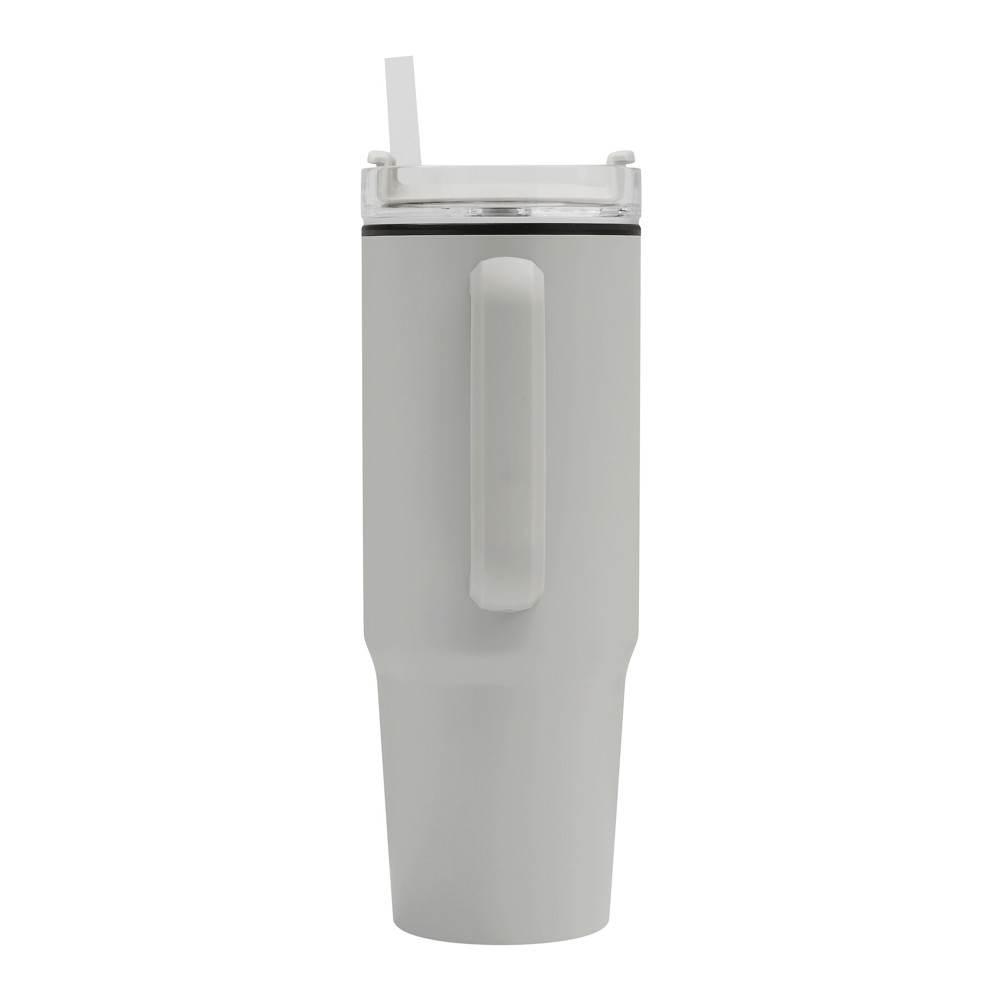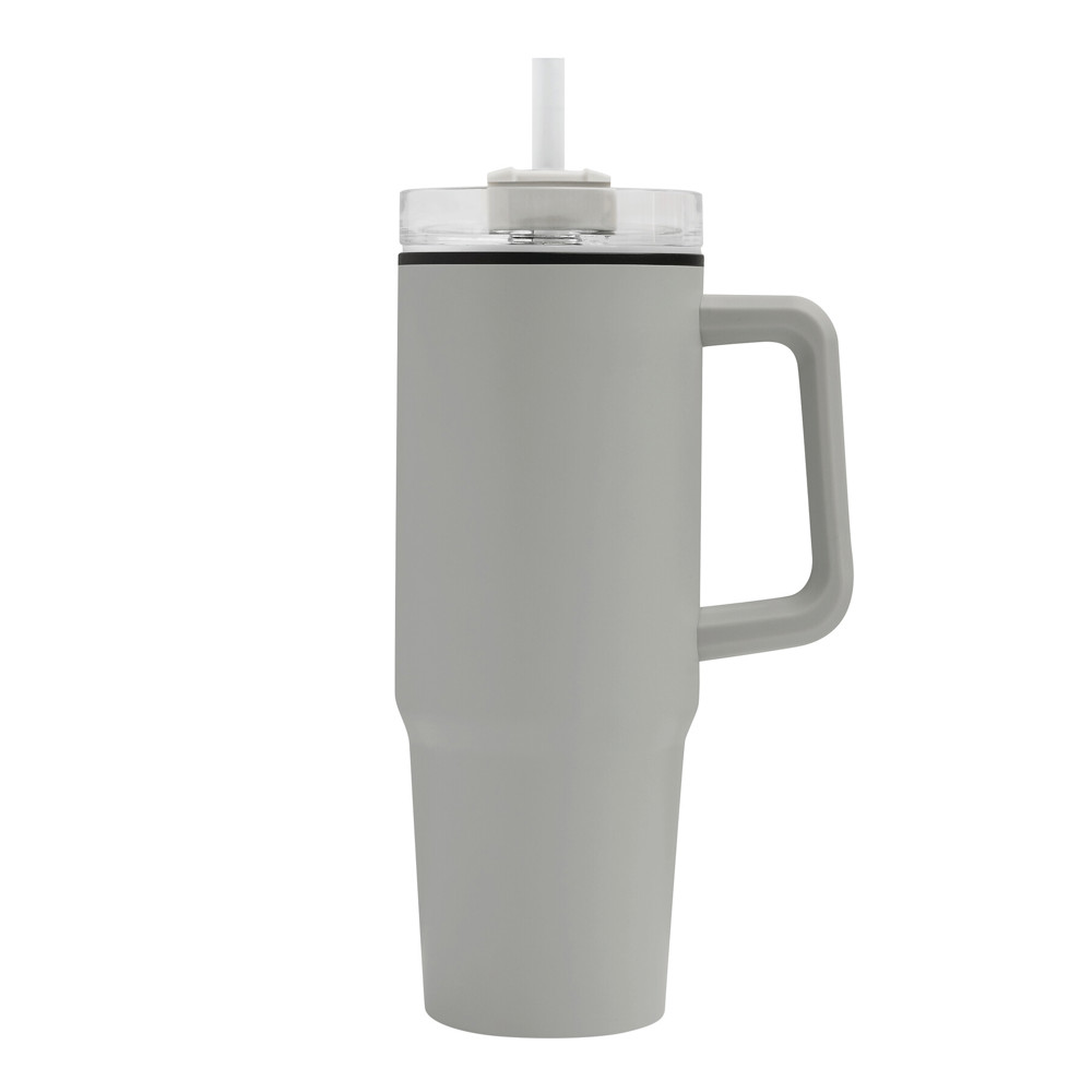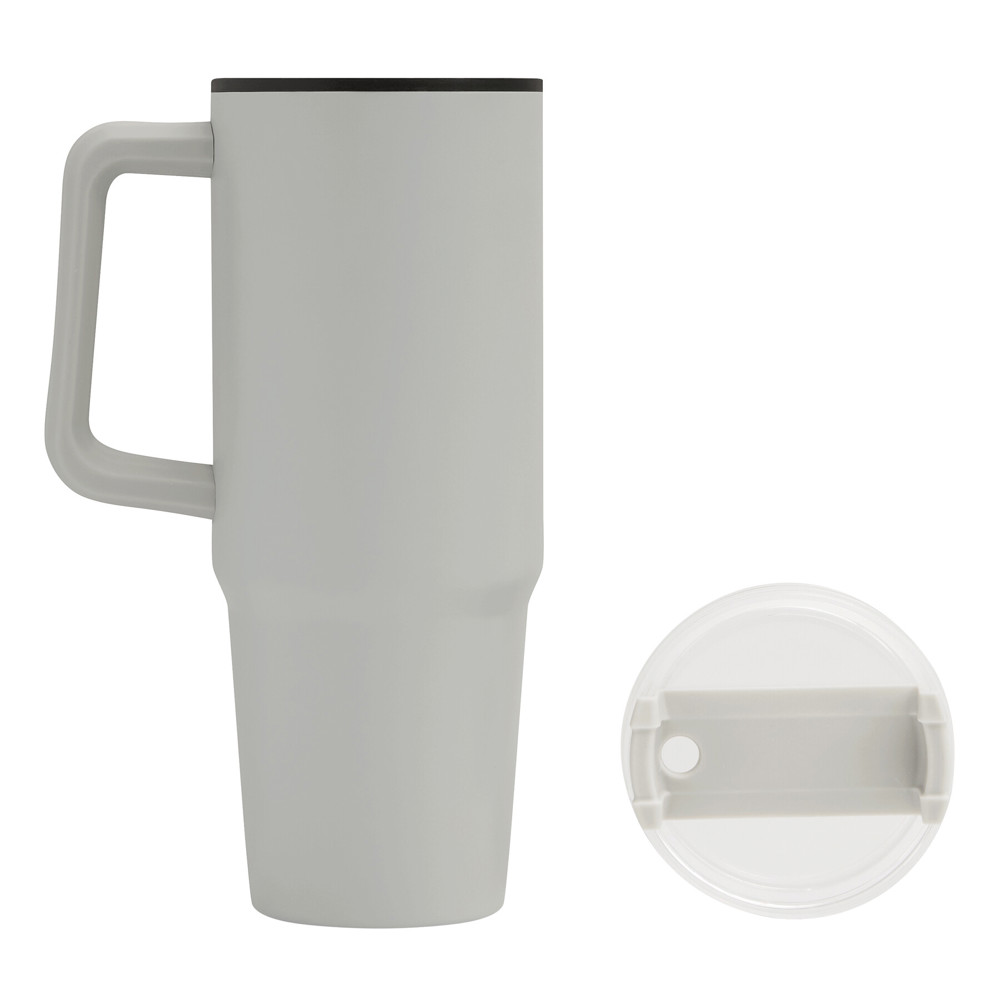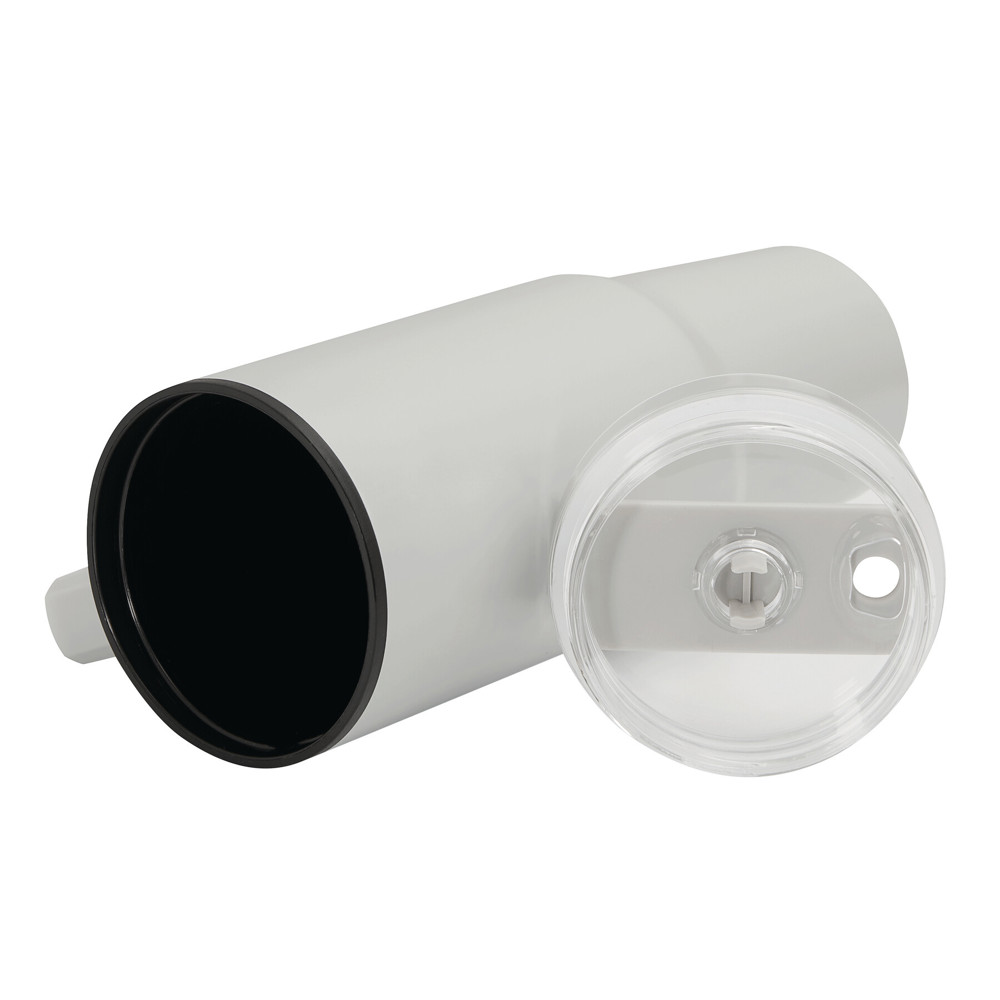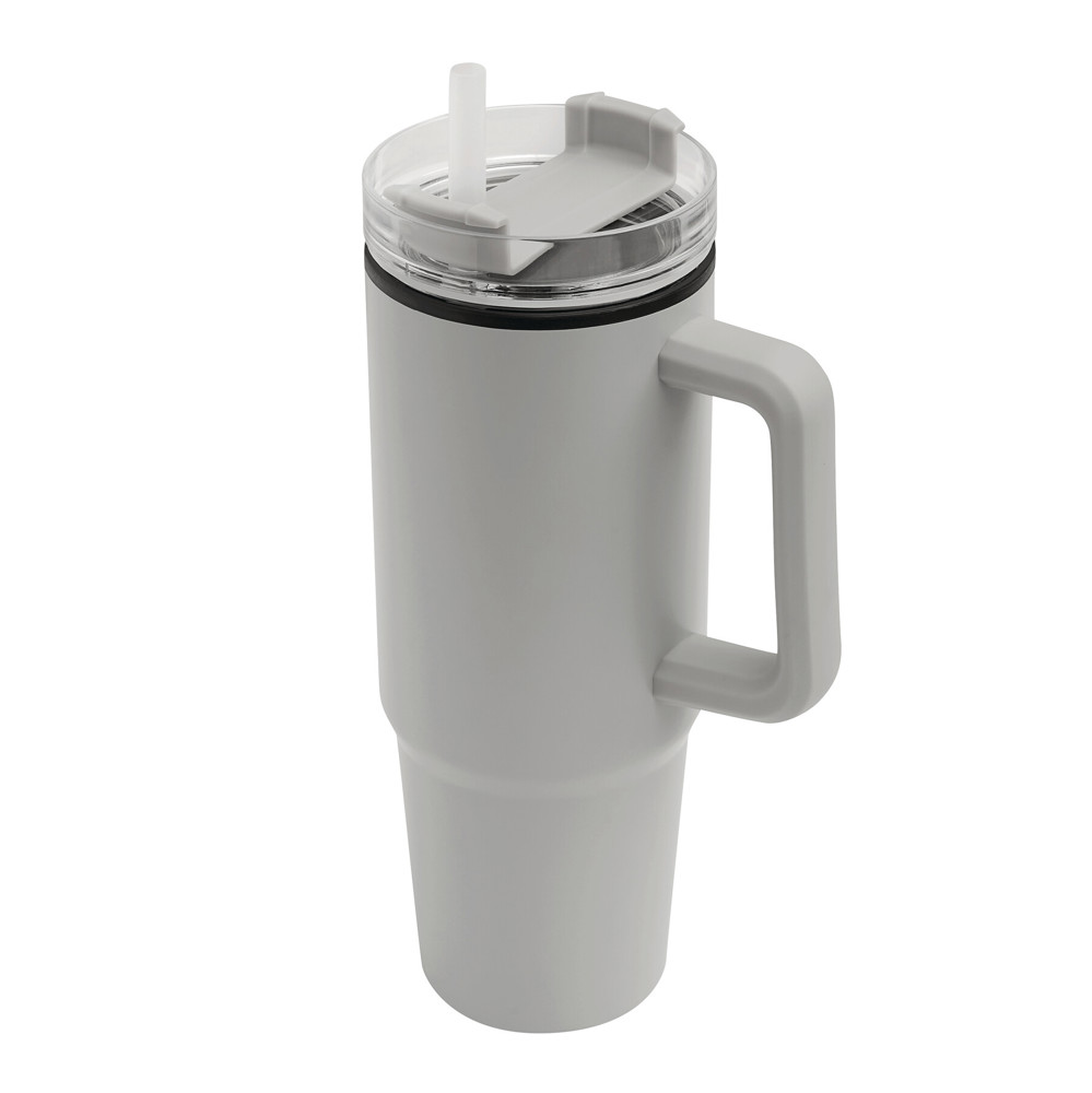 Drinking cup DRINK ULTY, double-walled: plastic on the inside and stainless steel on the outside, with practical handle, transparent plastic lid with secure screw cap, silicone sealing ring, drinking opening with rotating cover and transparent straw, capacity approx. 900 ml