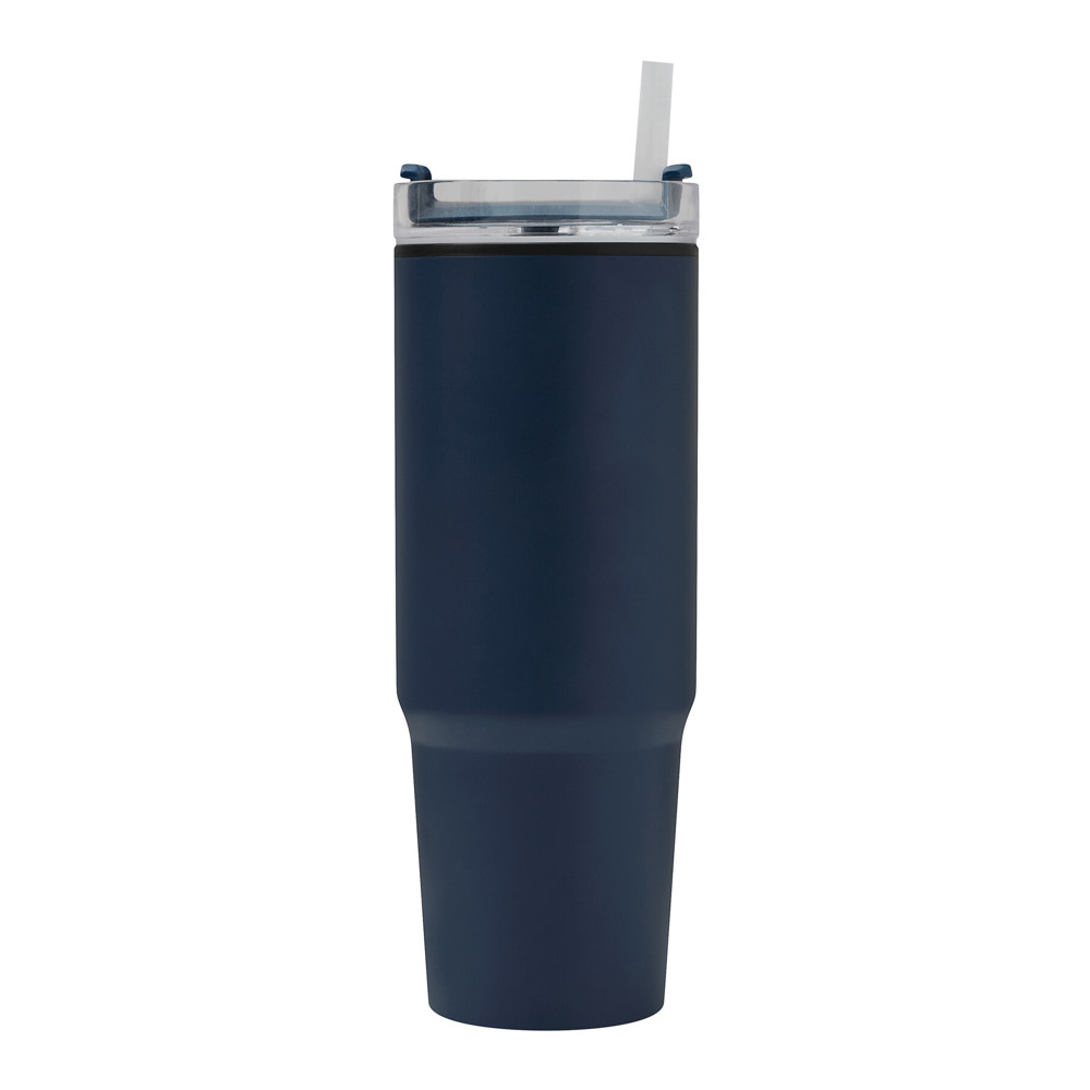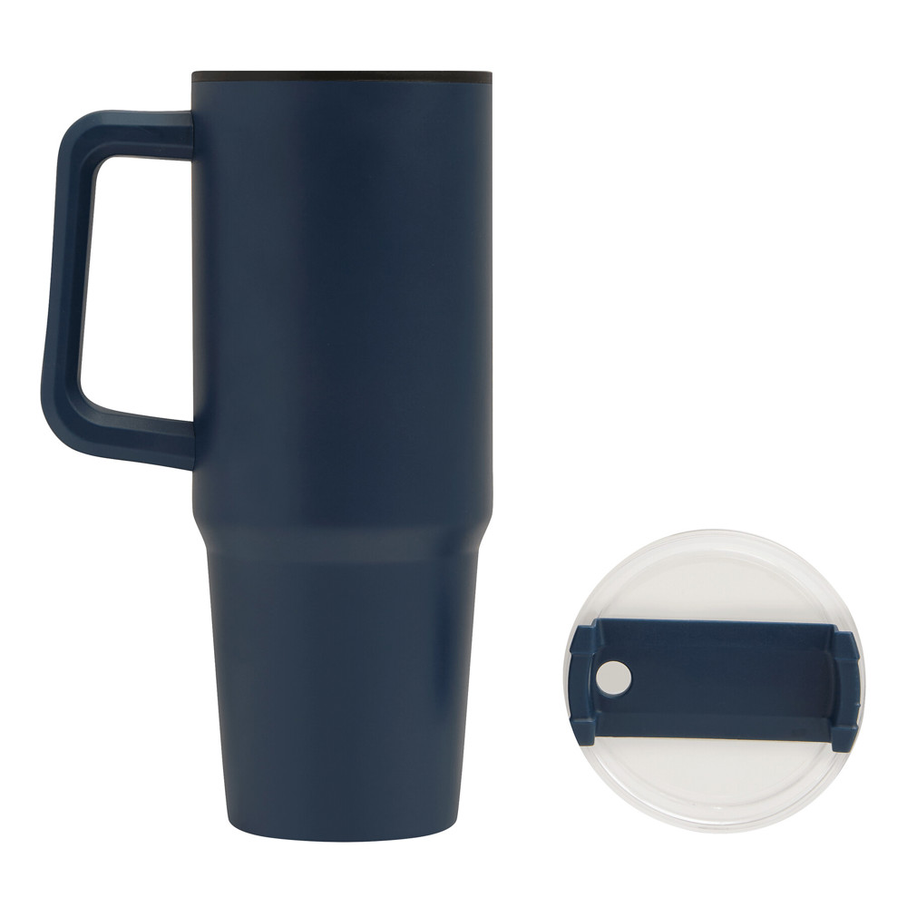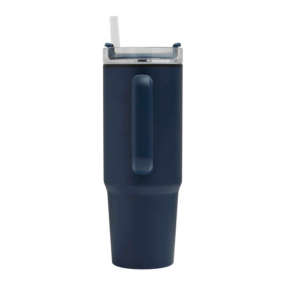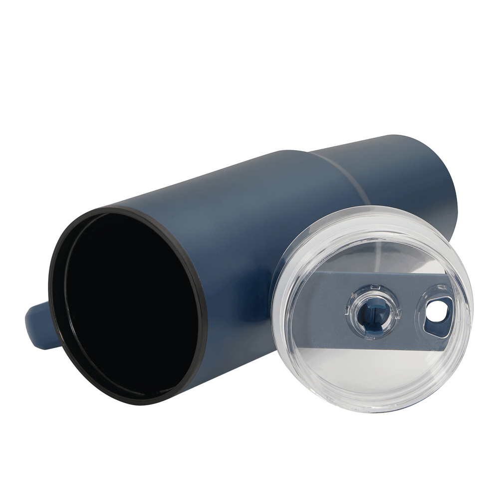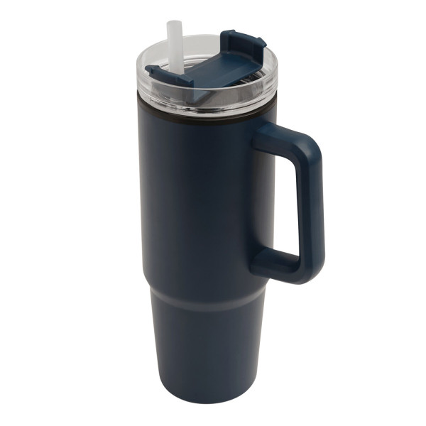 Drinking cup DRINK ULTY, double-walled: plastic on the inside and stainless steel on the outside, with practical handle, transparent plastic lid with secure screw cap, silicone sealing ring, drinking opening with rotating cover and transparent straw, capacity approx. 900 ml