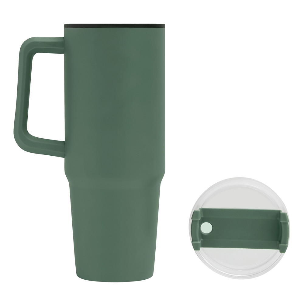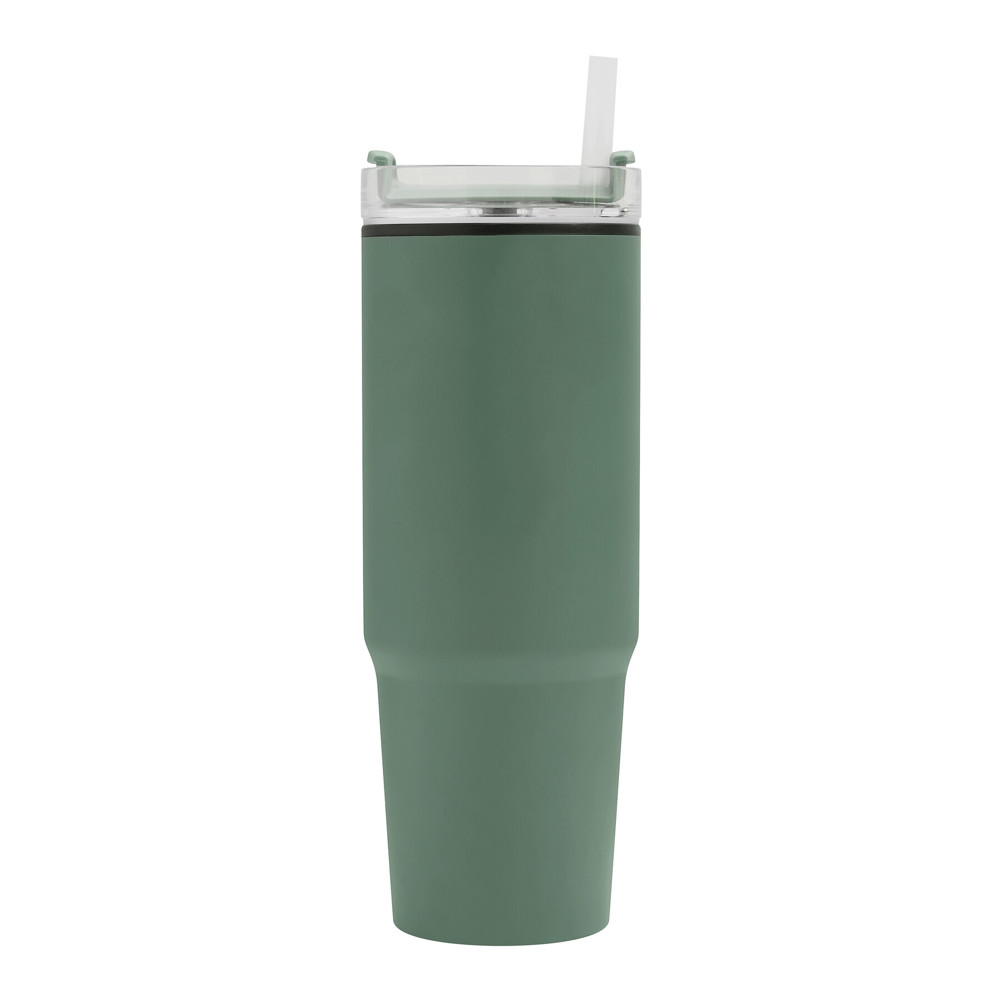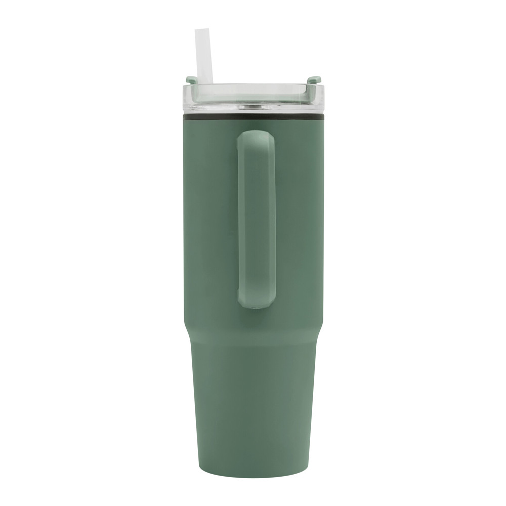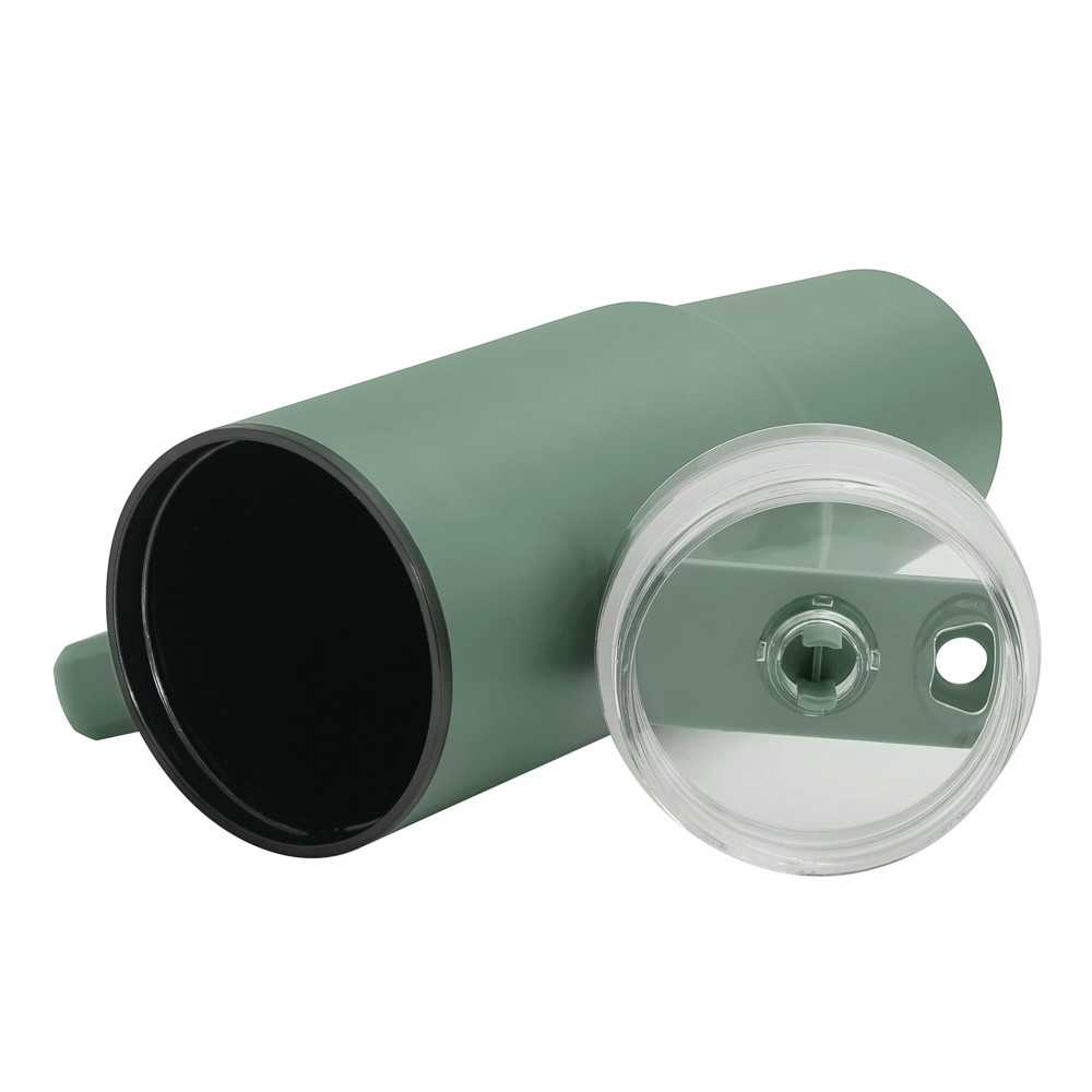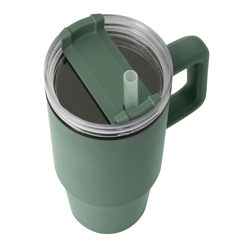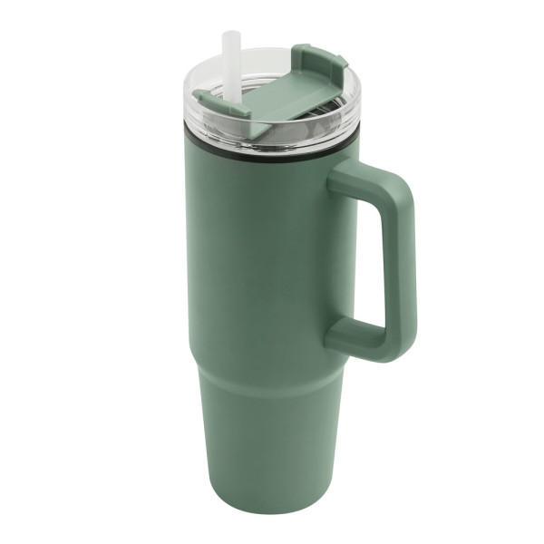 Drinking cup DRINK ULTY, double-walled: plastic on the inside and stainless steel on the outside, with practical handle, transparent plastic lid with secure screw cap, silicone sealing ring, drinking opening with rotating cover and transparent straw, capacity approx. 900 ml