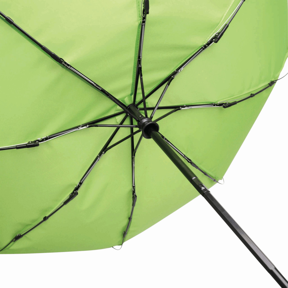 Automatic open/close windproof pocket umbrella CALYPSO with sheath in matching colour: 3-section metal shaft, with metal/plastic/fibreglass ribs and metal tips, bamboo handle with carrying loop in matching colour, polyester pongee canopy made from recycled plastic / RPET, closing strap with touch fastener