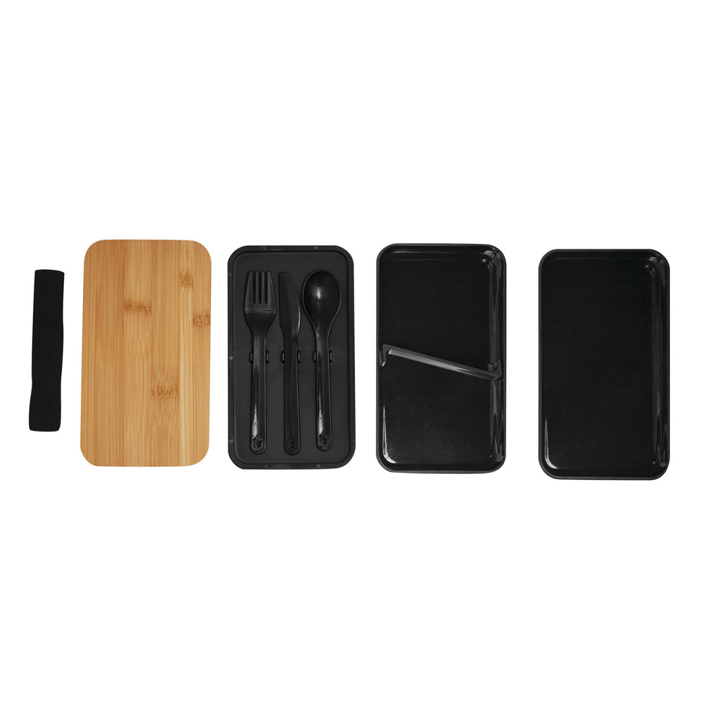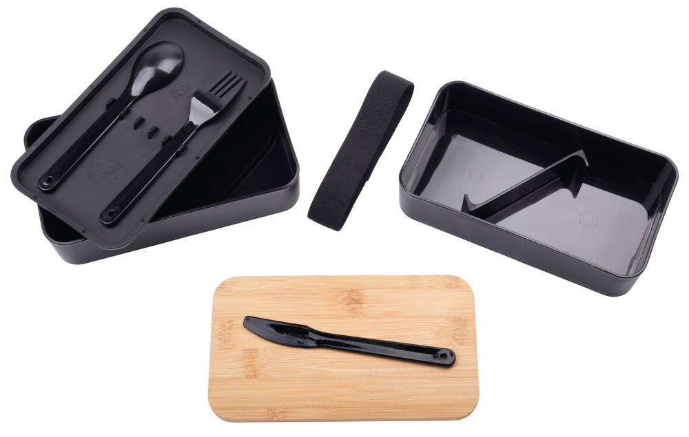 Lunch box DOUBLE LEVEL: with rubber band to keep the lid on tight, 2 separate boxes (capacity approx. 400 ml each), lid in between compartments with cutlery (knife, fork, spoon), movable insert to separate food in box, bamboo lid can also be used as a cutting board