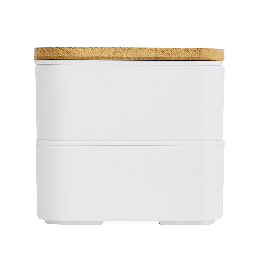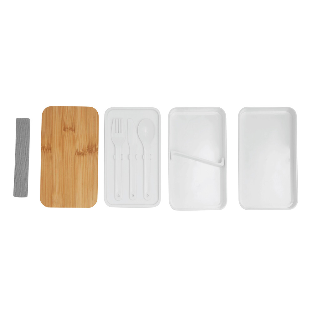 Lunch box DOUBLE LEVEL: with rubber band to keep the lid on tight, 2 separate boxes (capacity approx. 400 ml each), lid in between compartments with cutlery (knife, fork, spoon), movable insert to separate food in box, bamboo lid can also be used as a cutting board
