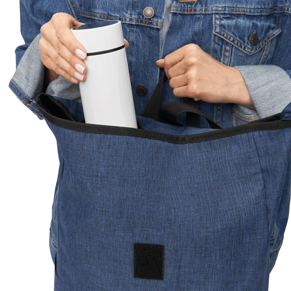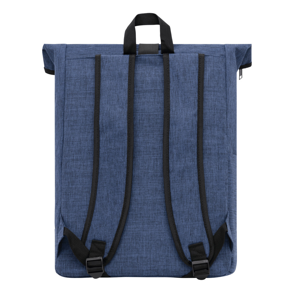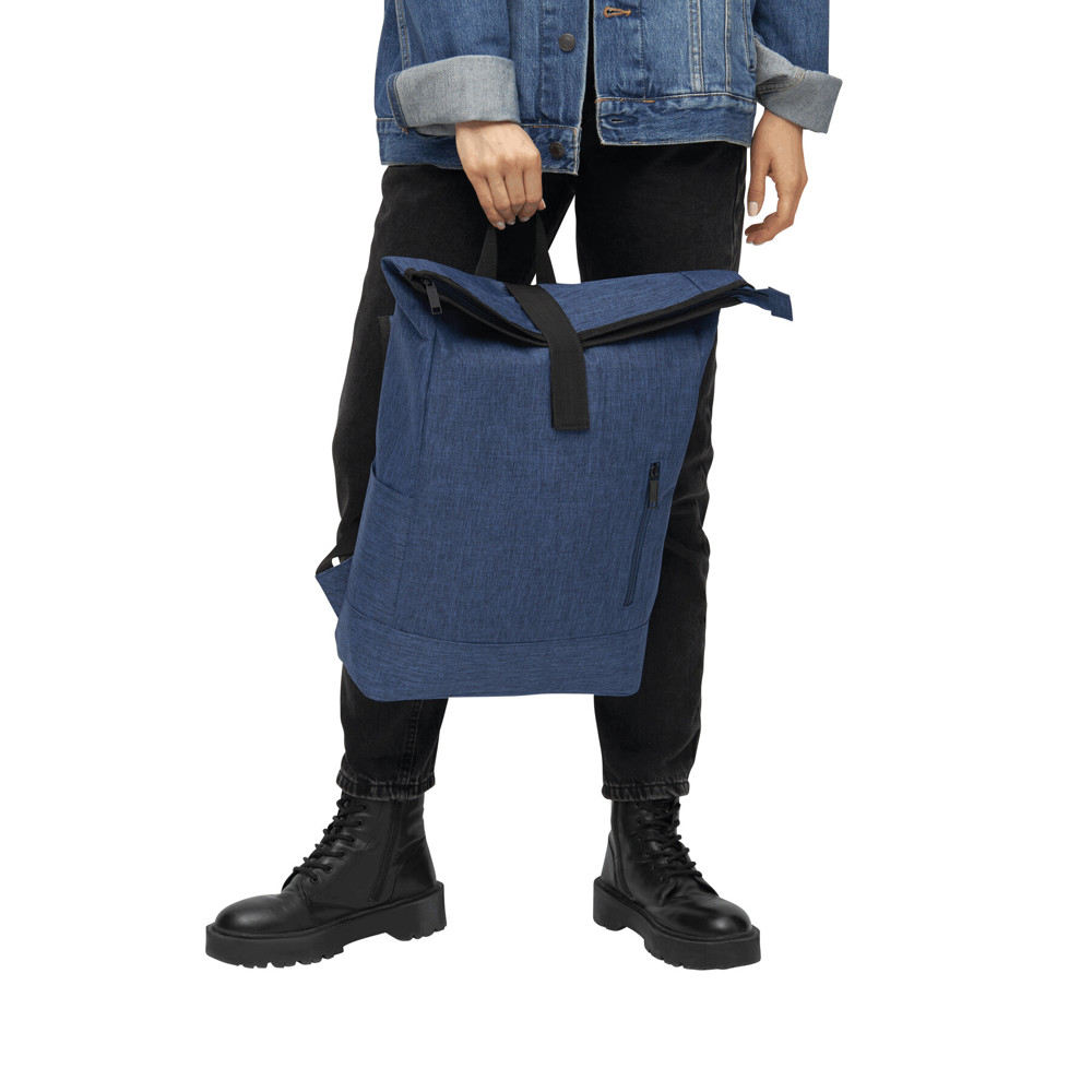 Backpack MESSENGER: front pocket with vertical zip, main compartment with zip and padded inner pocket for laptop or tablet, can be rolled up and closed with touch fastener, padded shoulder straps and back panel, grab handle