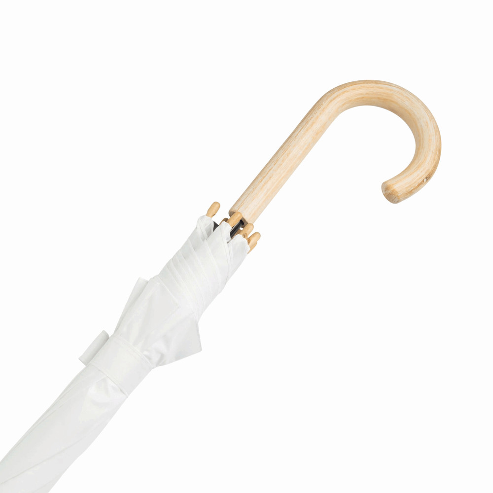 Automatic stick umbrella LIPSI: with metal shaft, fibreglass ribs, wooden tips, wooden crook handle, polyester pongee canopy made from recycled plastic / RPET, closing strap with touch fastener