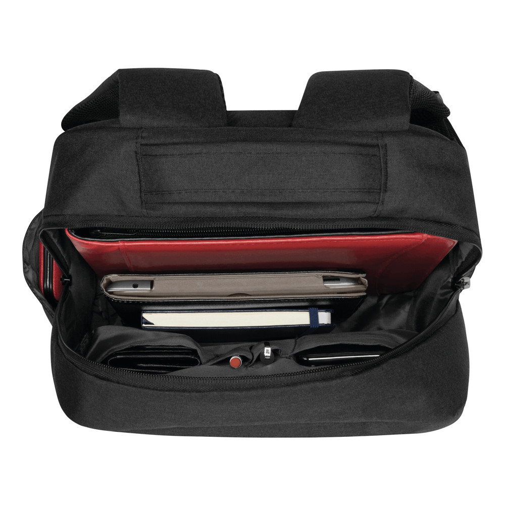 Backpack STOCKHOLM: 2 front pockets with zip, main compartment with zip and padded inner pocket for laptop or tablet, organiser with 4 pockets, 1 slip-in pocket on the side, padded grab handle, padded shoulder straps in ergonomic shape and padded back panel, trolley sleeve on the back side