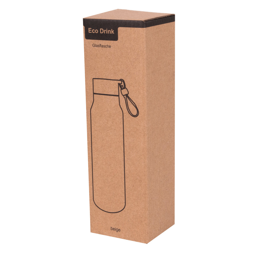 Glass drinking bottle ECO DRINK, coated: screw lid with carrying strap, made of renewable resources, glass, and plastic, capacity: approx. 300 ml, in a box