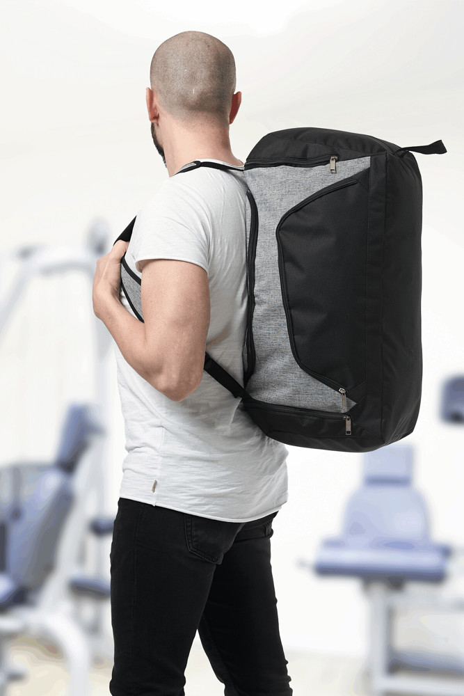 Sports bag 2 IN 1: spacious main compartment with zip, front pocket with zip, 1 additional carrying strap, 2 side pockets with zip, reinforced carrying handles, can also be used as a backpack