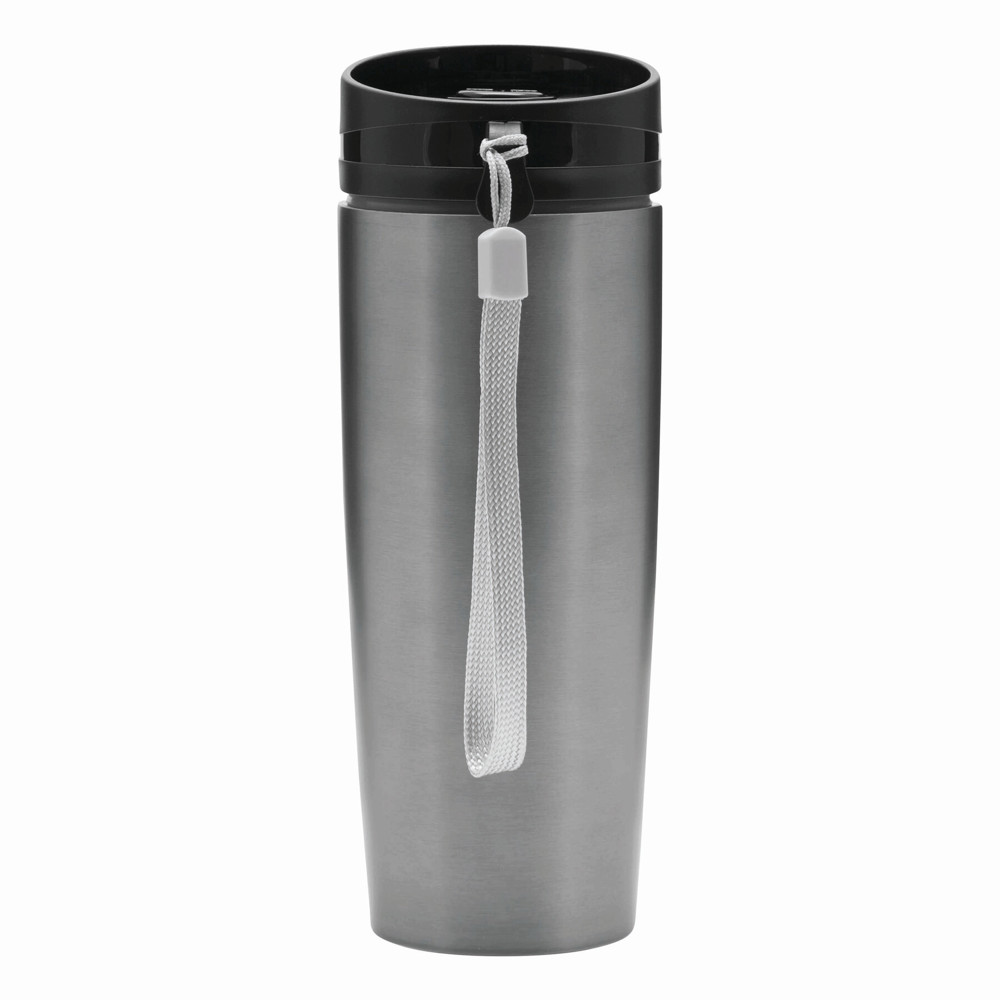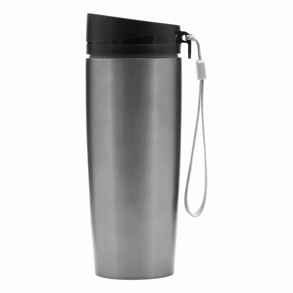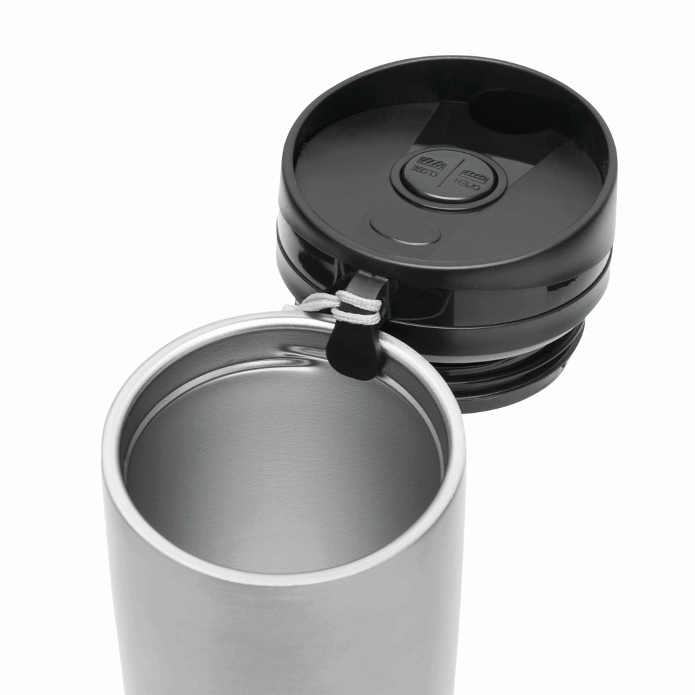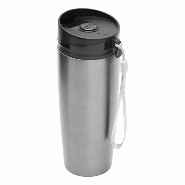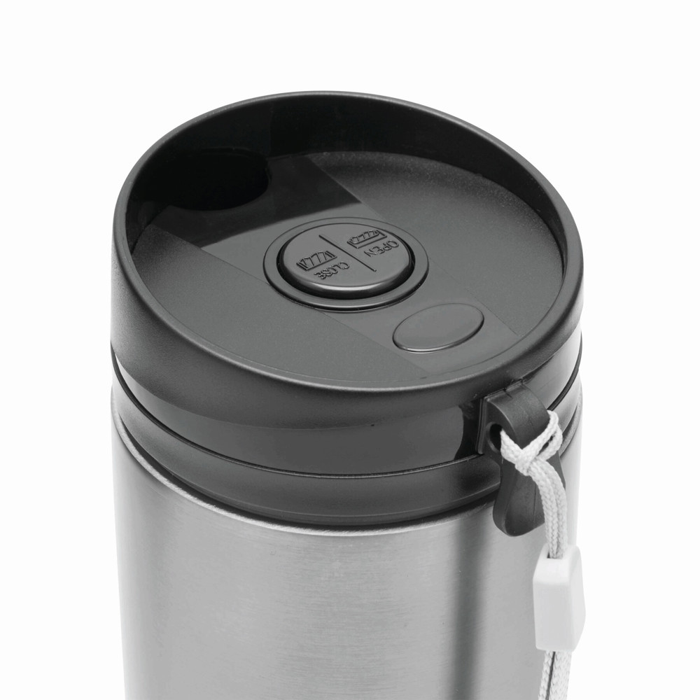 Double-walled travel mug EARLY MORNING: inside and outside made of stainless steel, plastic lid with secure screw cap, push button OPEN/CLOSE, and integrated drinking opening, rubber bottom, capacity approx. 380 ml, with carrying loop