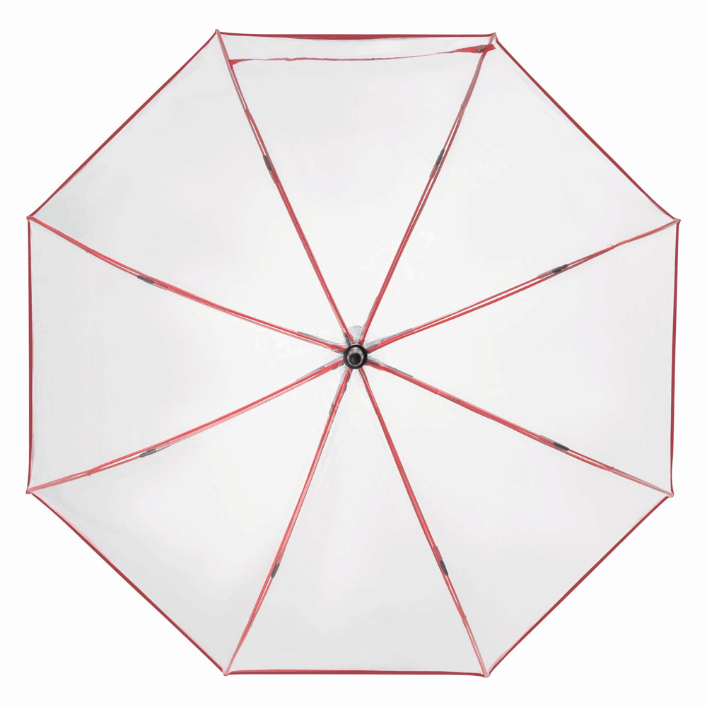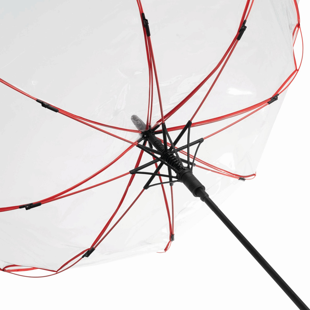 Automatic windproof stick umbrella VIP: metal shaft, coloured fibreglass ribs with metal tips, plastic top, plastic handle with integrated press button, transparent POE canopy with coloured binding, closure with press button